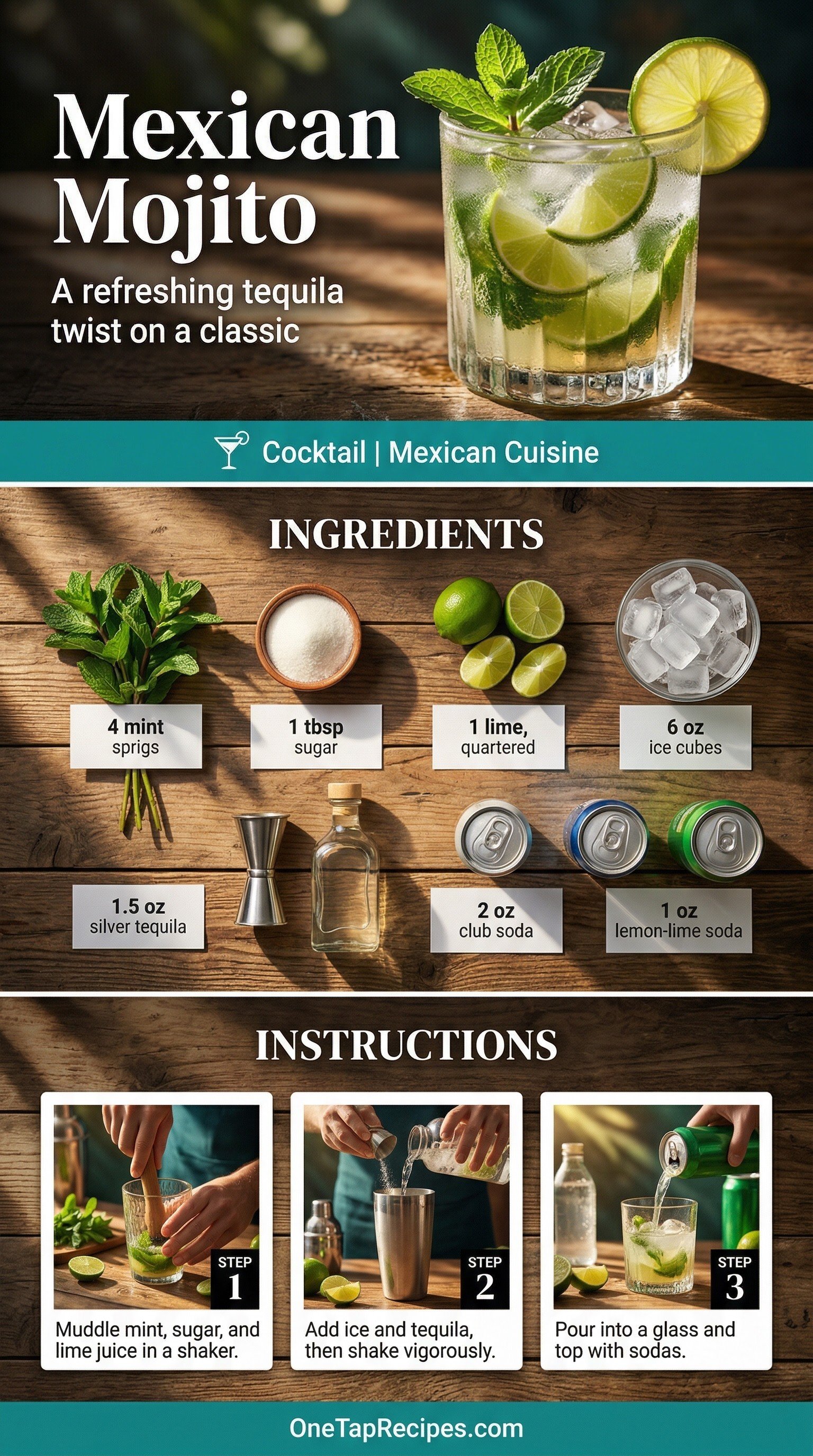 A classic Cuban cocktail gets a bright agave twist by swapping traditional rum for silver tequila. Fresh mint and lime juice muddle together with sugar to create a sweet, aromatic base. A vigorous shake with ice chills the mixture before a splash of club soda and lemon-lime soda adds the perfect amount of fizz. It is an incredibly refreshing drink for warm summer afternoons when garden mint is growing wild.