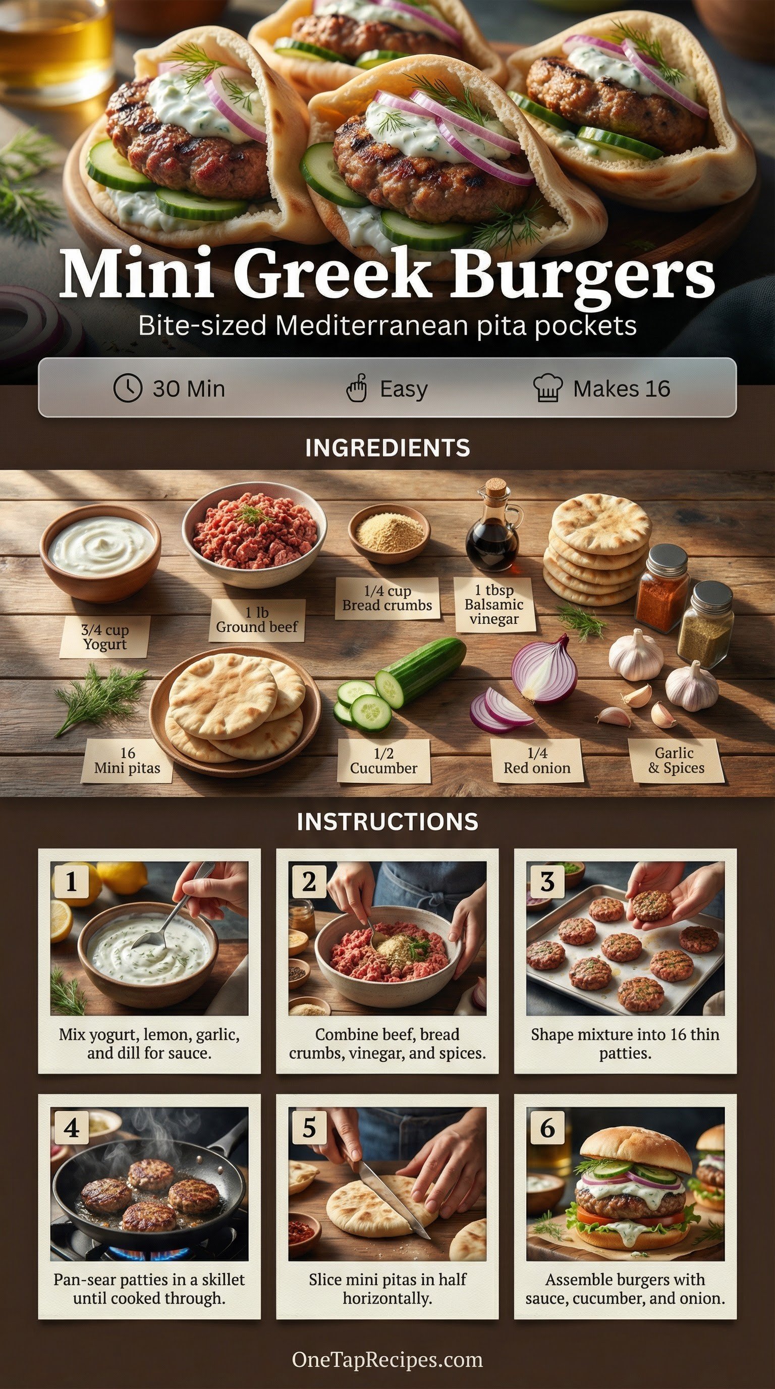 These bite-sized Greek burgers pack classic Mediterranean flavors into mini pita pockets. The lean ground beef is seasoned with oregano, thyme, and balsamic vinegar before being pan-seared to a juicy finish. They make an excellent appetizer for entertaining or a fun weeknight dinner for the family. A quick homemade yogurt and dill sauce adds a bright, creamy contrast to the savory meat and crisp fresh cucumbers.
