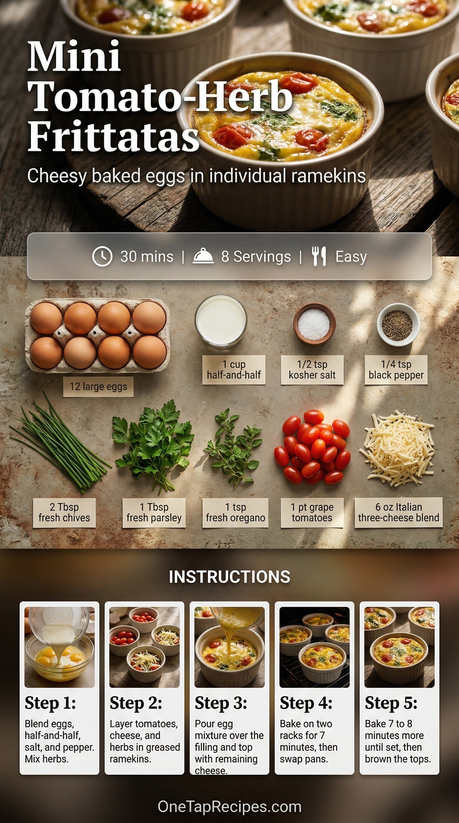 2. 2Arrange eight lightly greased four-inch ramekins across two baking sheets. Divide the halved grape tomatoes, one cup of the Italian cheese blend, and the mixed herbs evenly among the prepared ramekins.