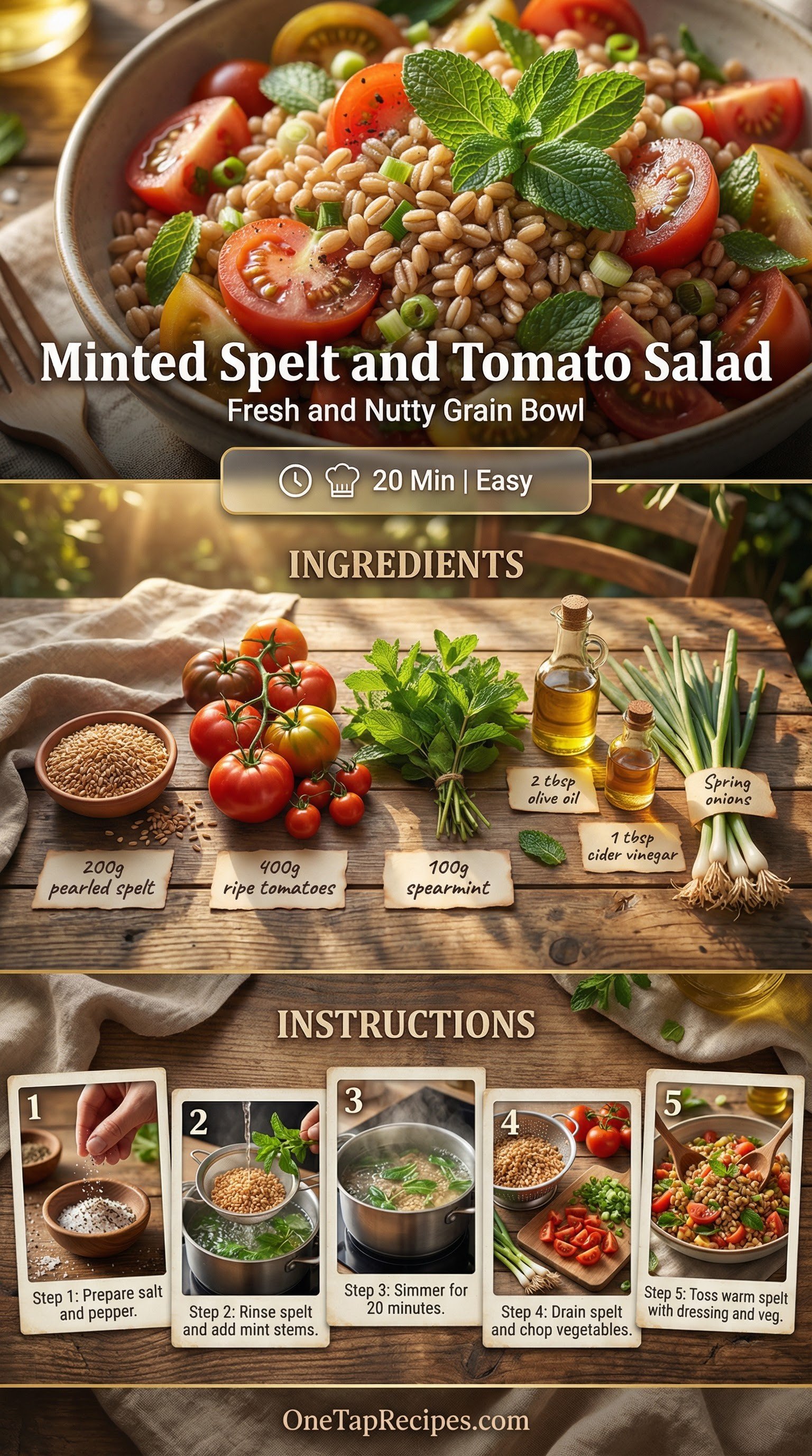 This minted spelt and tomato salad brings together nutty grains and bright summer produce. Pearled spelt cooks until tender before absorbing a simple dressing of olive oil and cider vinegar. Ripe tomatoes and fresh mint leaves add a refreshing sweetness to the bowl. Serve this warm or at room temperature for a light lunch or a fresh side dish.