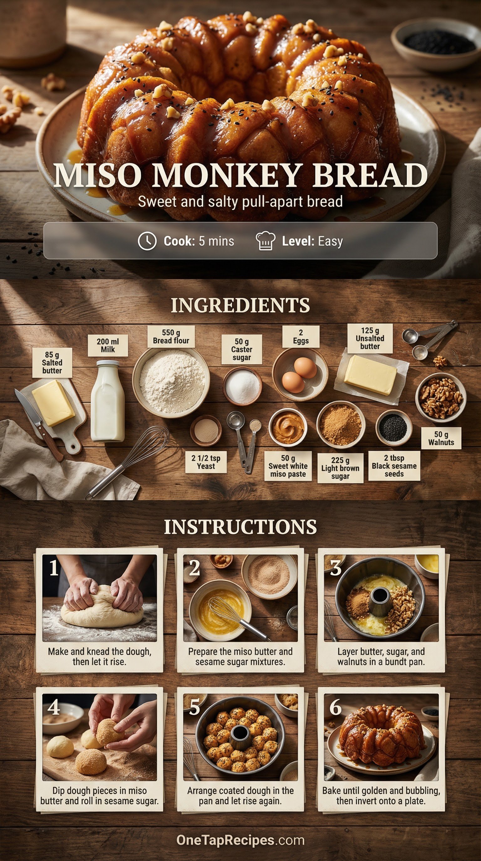 Miso monkey bread is a pull-apart baked treat featuring warm balls of sticky dough coated in a savory-sweet glaze. The addition of sweet white miso paste brings a deep, salty umami flavor that perfectly balances the rich brown sugar and butter. It makes a fantastic centerpiece for a weekend brunch or a cozy holiday morning. Crunchy black sesame seeds and toasted walnuts add a satisfying texture to every soft, pillowy bite.