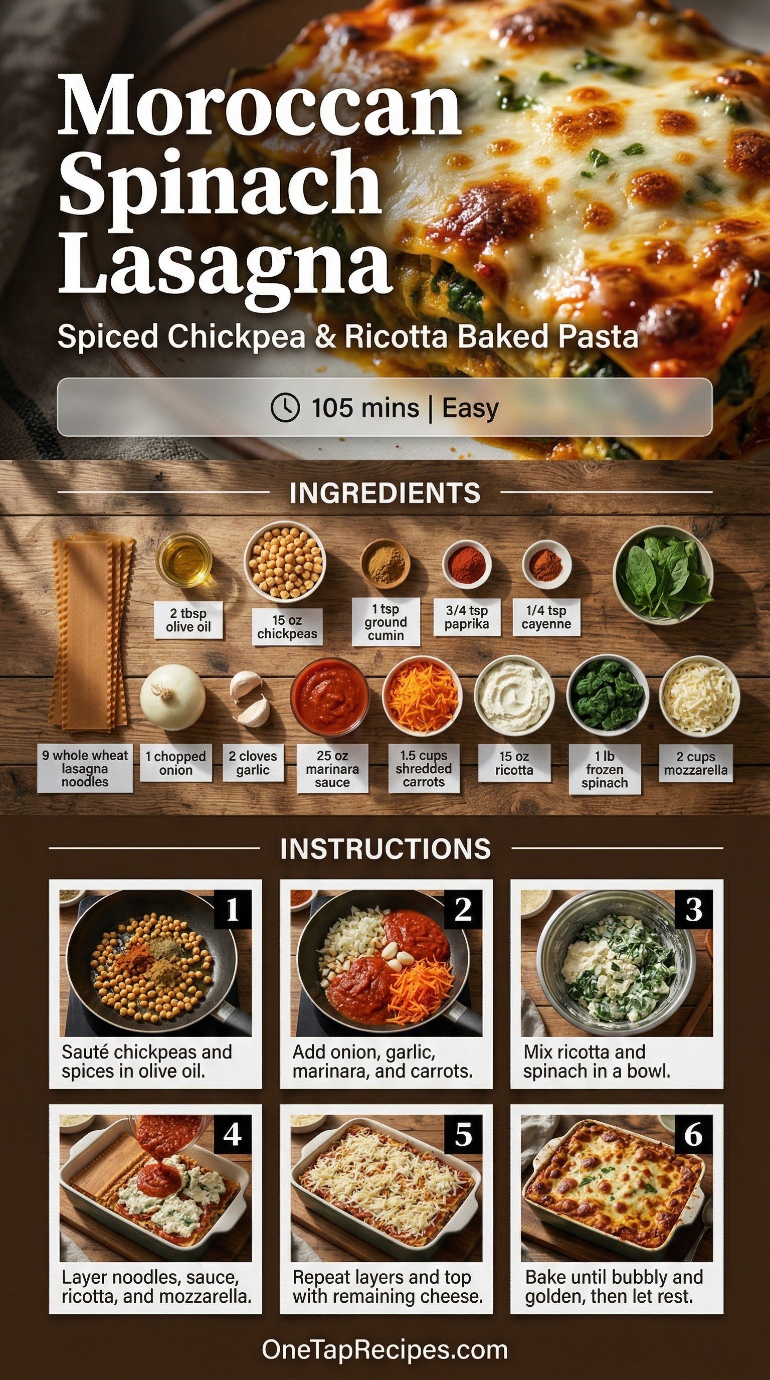 A hearty vegetarian lasagna brings together classic Italian comfort and warm North African spices. This baked dish layers whole wheat noodles with a spiced chickpea and carrot marinara, alongside a rich spinach and ricotta filling. Cumin and paprika add a smoky, earthy depth to the sweet tomato sauce. It makes a satisfying weeknight dinner that packs in plenty of vegetables and plant-based protein.