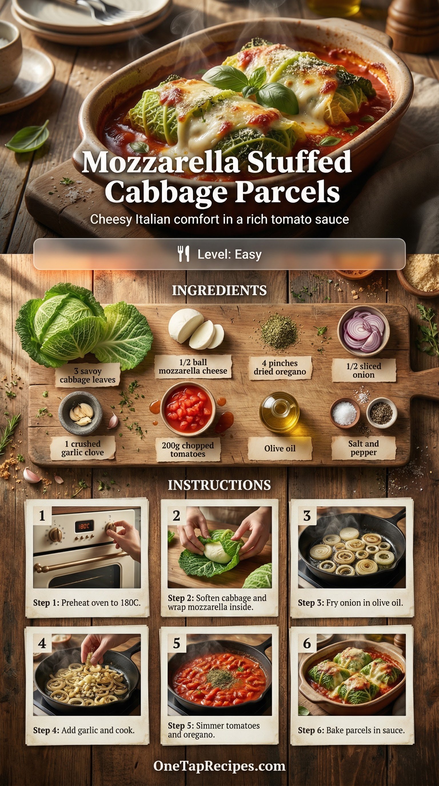 These savory cabbage parcels are stuffed with gooey mozzarella and baked in a simple, rustic tomato sauce. It is a brilliant way to use up leftover savoy cabbage leaves while delivering classic Italian comfort food flavors. Serve this warm, comforting dish for a light lunch or a cozy weeknight dinner. The tender cabbage yields to a melted cheese center, perfectly balanced by the bright and garlicky tomato base.