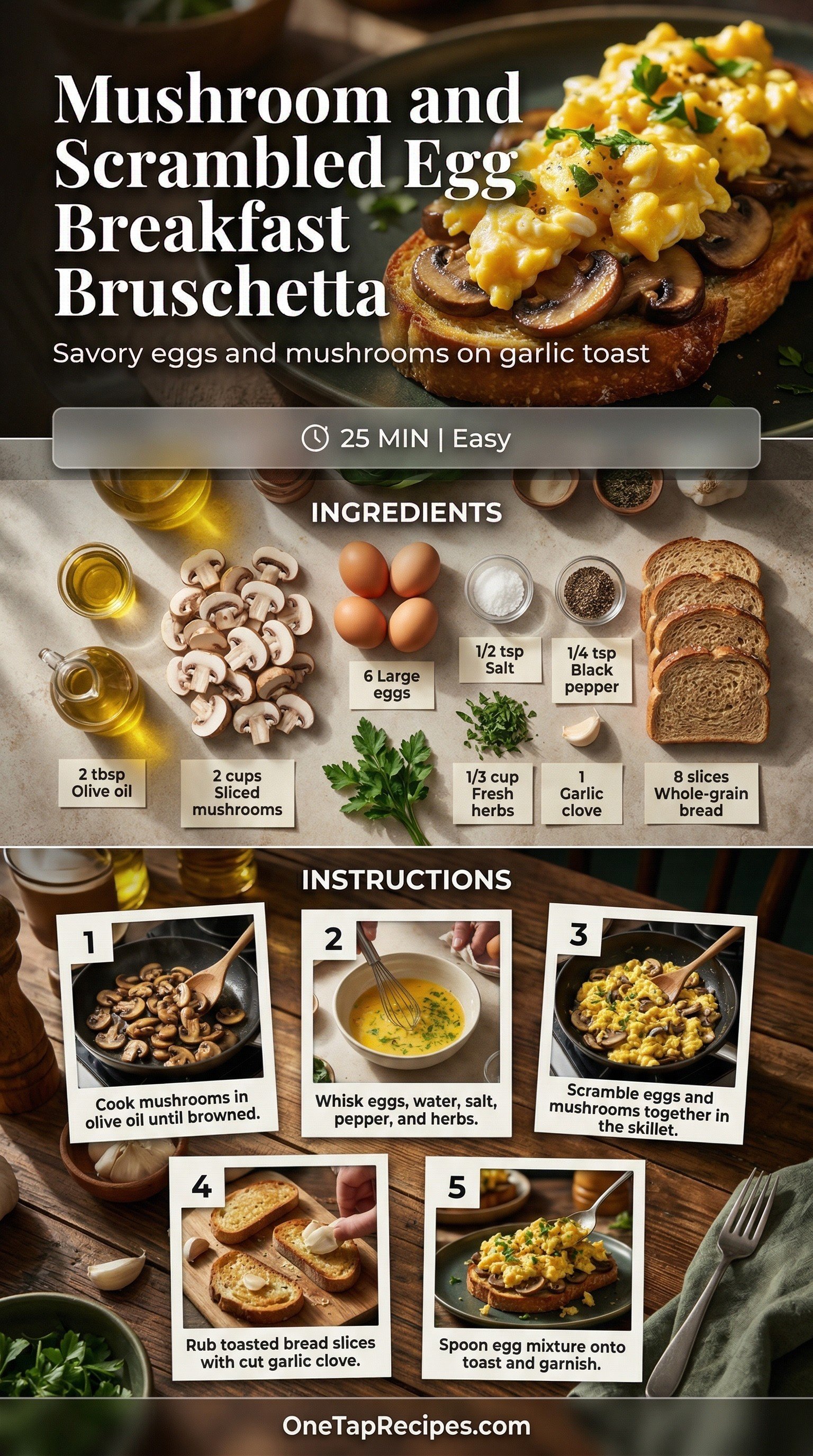 This savory breakfast bruschetta pairs soft-scrambled eggs with deeply browned mushrooms over garlic-rubbed whole-grain toast. Cooking both the mushrooms and the eggs in extra-virgin olive oil creates a rich texture that elevates a simple morning meal. Fresh herbs like dill, parsley, or basil add a bright finish to the earthy mushrooms. It is a satisfying, protein-rich option for a relaxed weekend brunch or a filling weekday start.