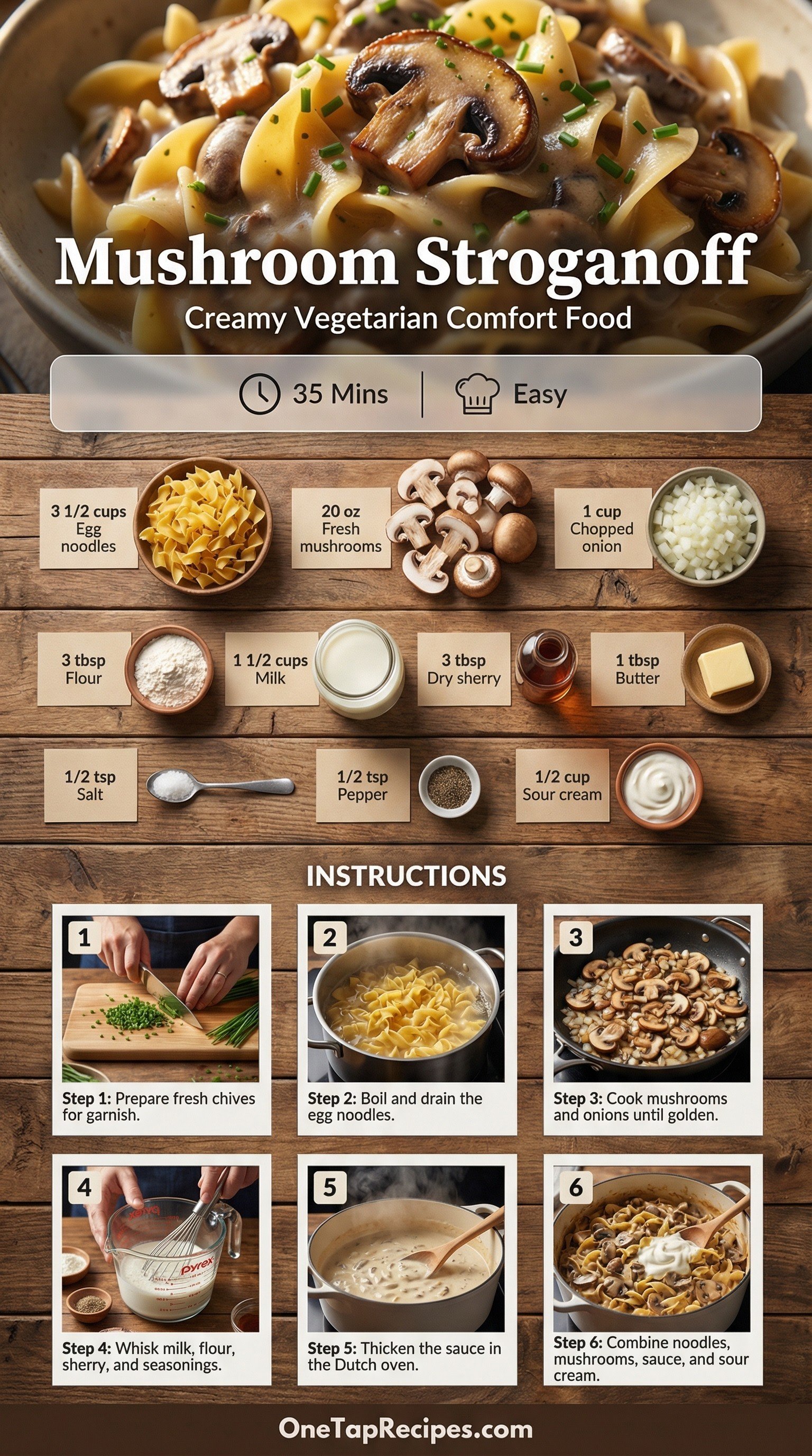 This comforting vegetarian dish transforms a classic stroganoff by using a hearty blend of fresh mushrooms instead of beef. It comes together quickly in a single Dutch oven with a creamy sauce made from milk, fat-free sour cream, and a splash of dry sherry. The recipe is perfect for a cozy weeknight dinner when you want something rich and satisfying but lighter than traditional versions. Earthy mushrooms and tender egg noodles soak up the savory, slightly tangy sauce beautifully. Finish the bowls with fresh chives for a bright pop of color and flavor.
