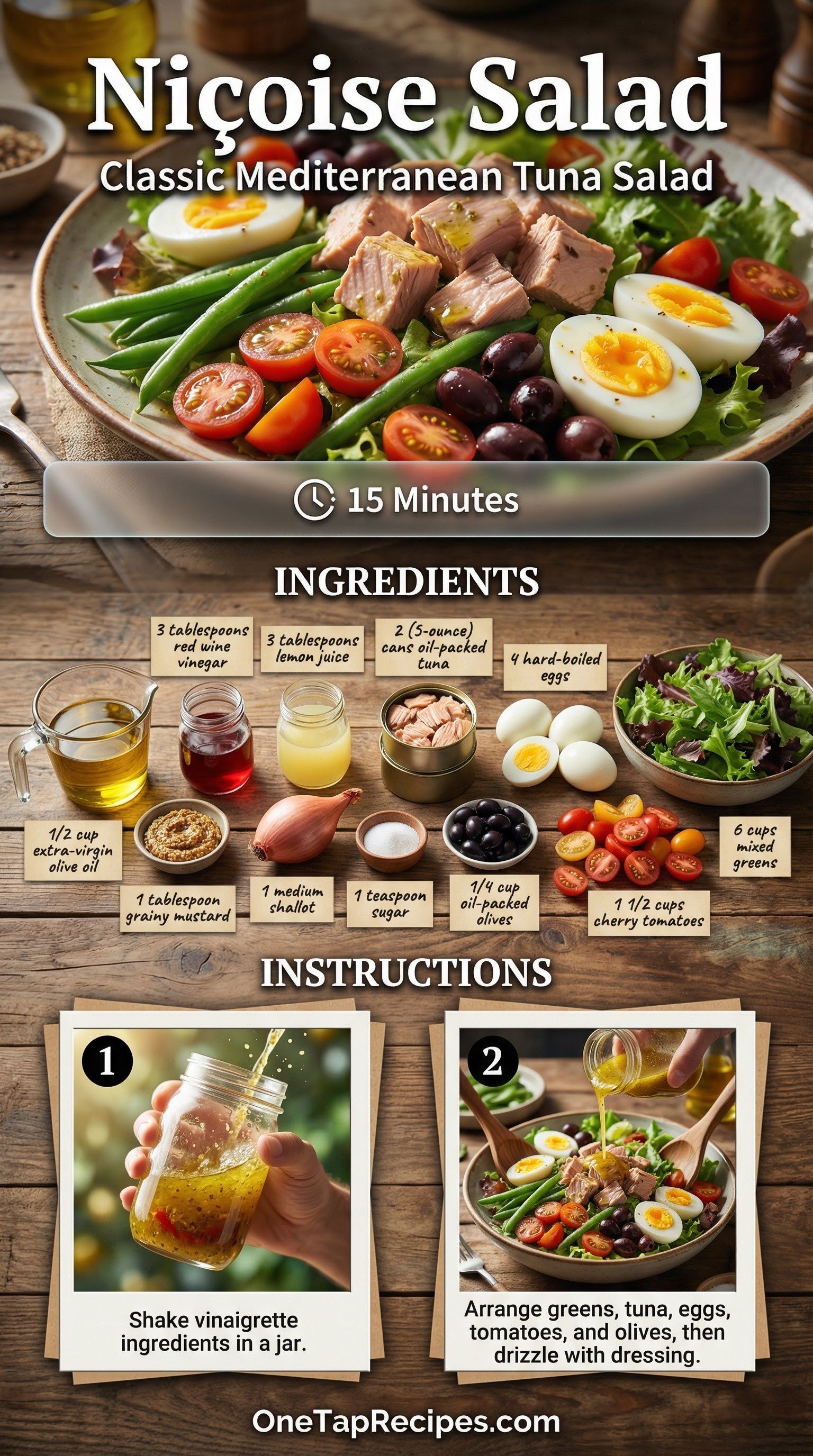 A traditional Niçoise salad brings together bright Mediterranean flavors in a single satisfying bowl. Crisp mixed greens provide a fresh base for rich oil-packed tuna, briny olives, and tender hard-boiled eggs. Sweet cherry tomatoes add a burst of color and acidity to balance the savory elements. Everything gets tied together with a sharp, punchy shallot vinaigrette made from red wine vinegar, lemon juice, and grainy mustard. It makes an excellent light lunch or a refreshing dinner on a warm evening.