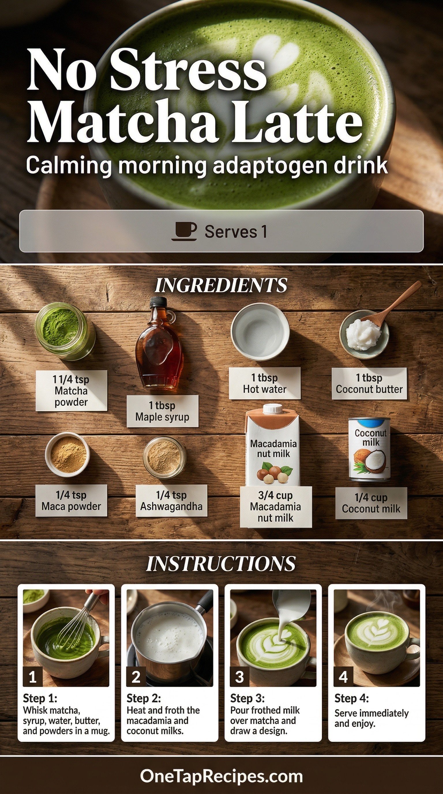 Start your morning with a warm, comforting matcha latte infused with adaptogens. This calming drink blends earthy matcha powder with maca and ashwagandha for a balanced start to the day. A mix of macadamia nut milk, coconut milk, and coconut butter creates a rich, creamy texture. Sweetened naturally with a touch of maple syrup, it is the perfect beverage for a quiet, relaxing morning routine.