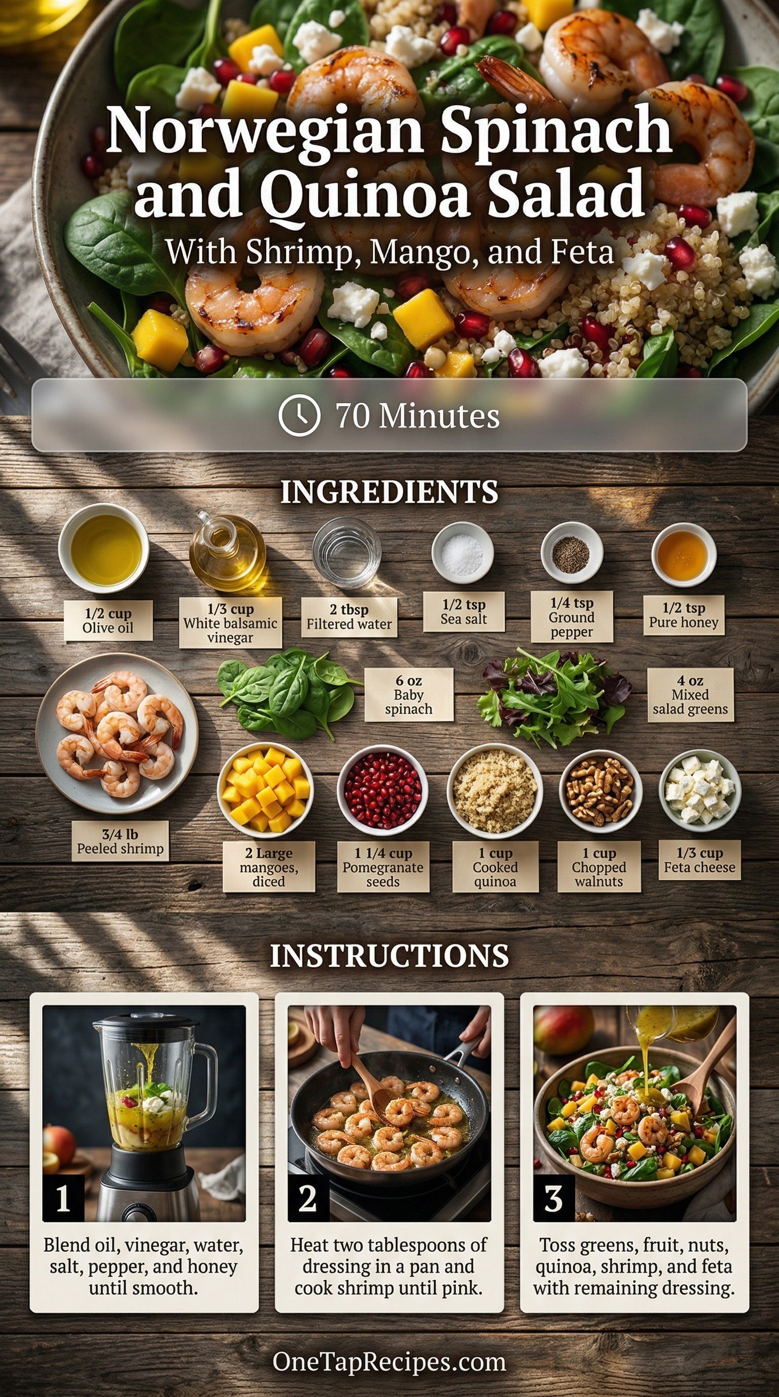 A bright and hearty salad brings together fresh baby greens, tender spinach, and protein-packed quinoa. Sweet diced mangoes and tart pomegranate seeds add a refreshing burst of fruit flavor to every bite. Pan-seared shrimp provides a satisfying main element, while chopped walnuts and crumbled feta cheese deliver a crunchy, salty finish. A simple homemade white balsamic dressing ties the bowl together with a smooth, tangy bite. Serve it as a light lunch or a refreshing dinner during the colder months.