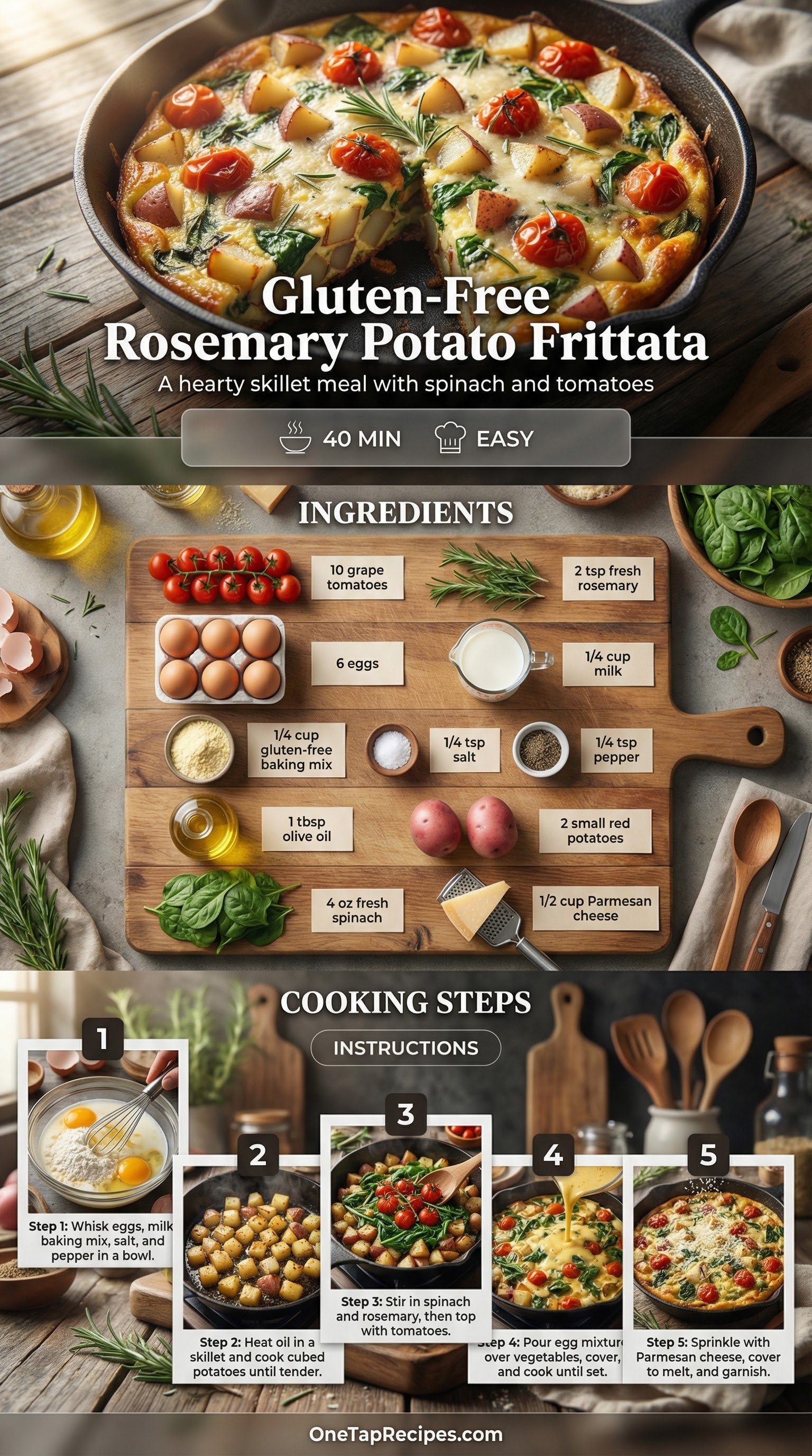 Sweet grape tomatoes and earthy fresh rosemary take center stage in this hearty skillet meal. A touch of gluten-free baking mix gives the eggs an incredibly fluffy texture, while tender red potatoes and fresh spinach make it filling enough for any time of day. It finishes with a savory layer of melted Parmesan cheese right on top. You'll love how this entire dish cooks in a single pan, leaving you with fewer dishes to wash.