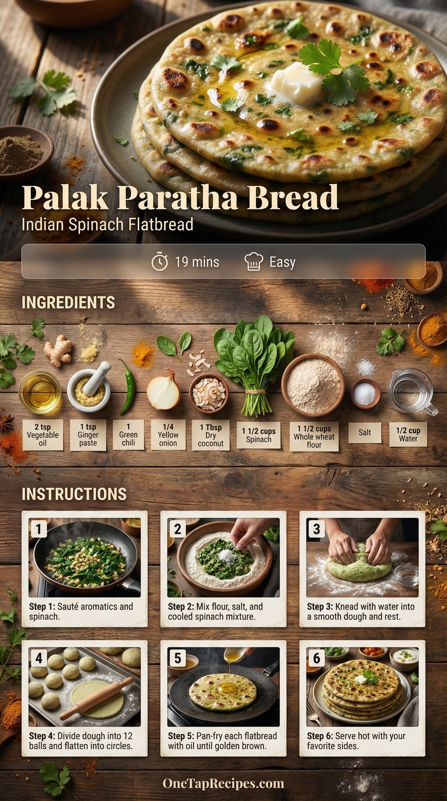 Palak paratha is a classic Indian flatbread packed with fresh spinach and warm aromatics. This version builds deep flavor by sautéing green chilies, ginger, and grated coconut before mixing them directly into the whole wheat dough. It is a fantastic way to sneak extra greens into a meal while keeping the texture soft and satisfying. Serve these bright green flatbreads alongside your favorite curries, dals, or simply with a dollop of plain yogurt for a quick weeknight dinner. The pan-frying process gives each bread a beautifully golden, slightly crisp exterior.