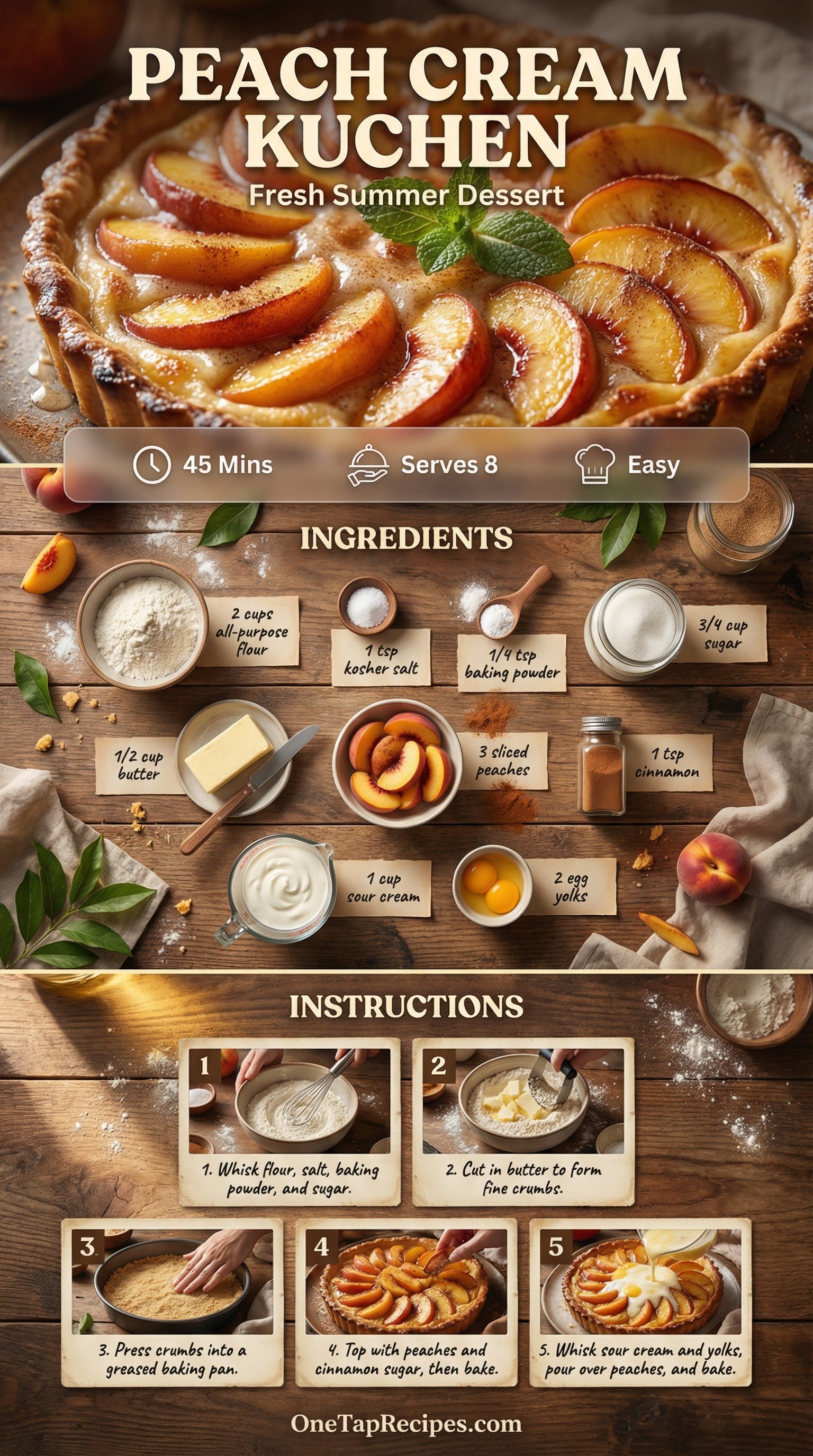 Peach Cream Kuchen is a classic German-inspired dessert that pairs a tender, buttery crust with fresh summer fruit. The base comes together quickly by cutting butter into a simple flour mixture, creating a rich foundation for the filling. Ripe, juicy peaches are layered over the crust and dusted with cinnamon sugar before baking. A smooth custard made from sour cream and egg yolks is poured over the top to finish the dish. Serve it warm from the oven or chilled for a refreshing afternoon treat.
