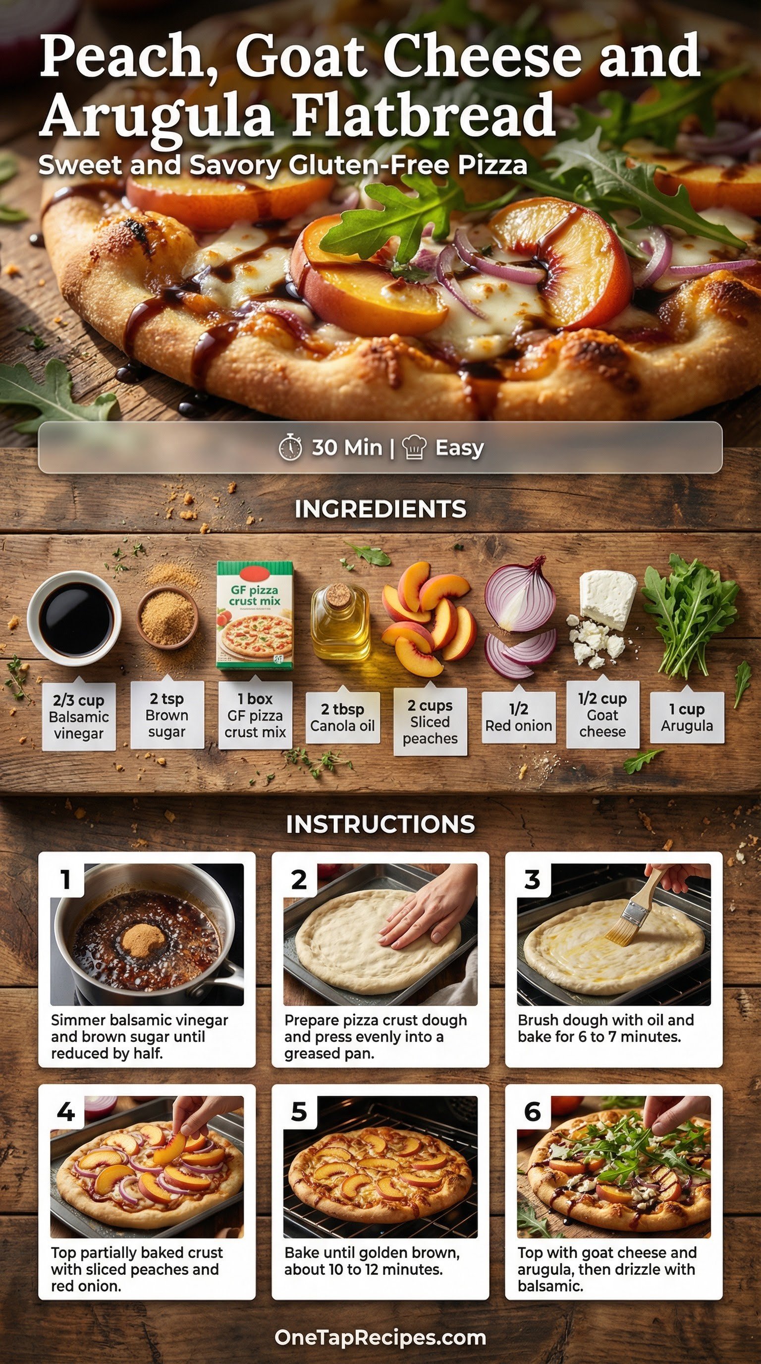 Sweet and savory flavors come together in this fresh flatbread, pairing juicy peaches with tangy goat cheese and peppery arugula. A simple gluten-free pizza crust mix keeps the prep work fast and easy. A homemade balsamic reduction drizzled over the top brings everything into perfect balance. Serve it as a light summer dinner or slice it up for a weekend appetizer.