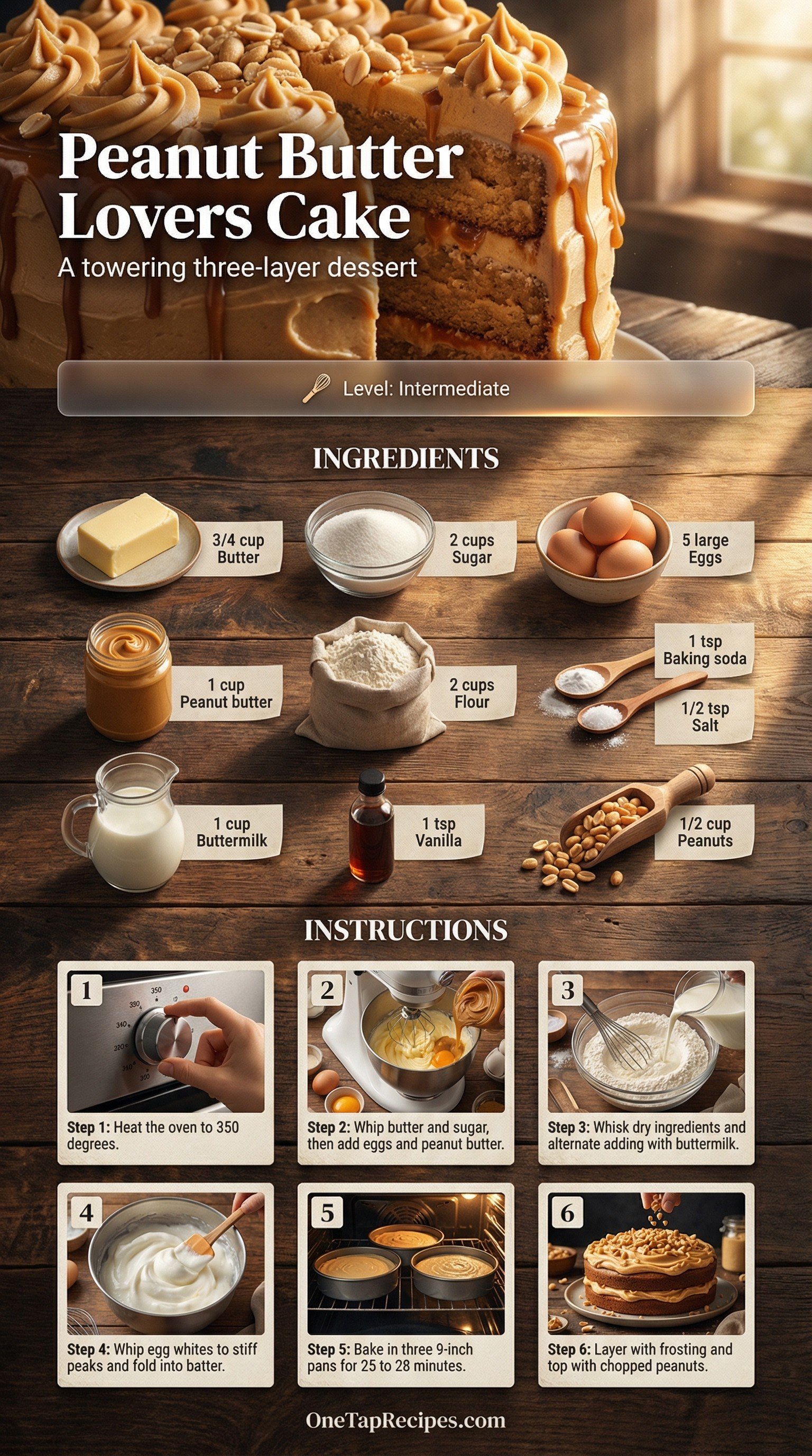 A towering three-layer cake packed with rich peanut butter flavor in both the sponge and the frosting. The batter uses buttermilk for a tender crumb and whipped egg whites for a light, airy texture that balances the dense peanut butter. It is a perfect dessert for birthdays or weekend gatherings, offering a sweet, salty, and nutty profile. Chopped peanuts add a welcome crunch to the smooth finish.