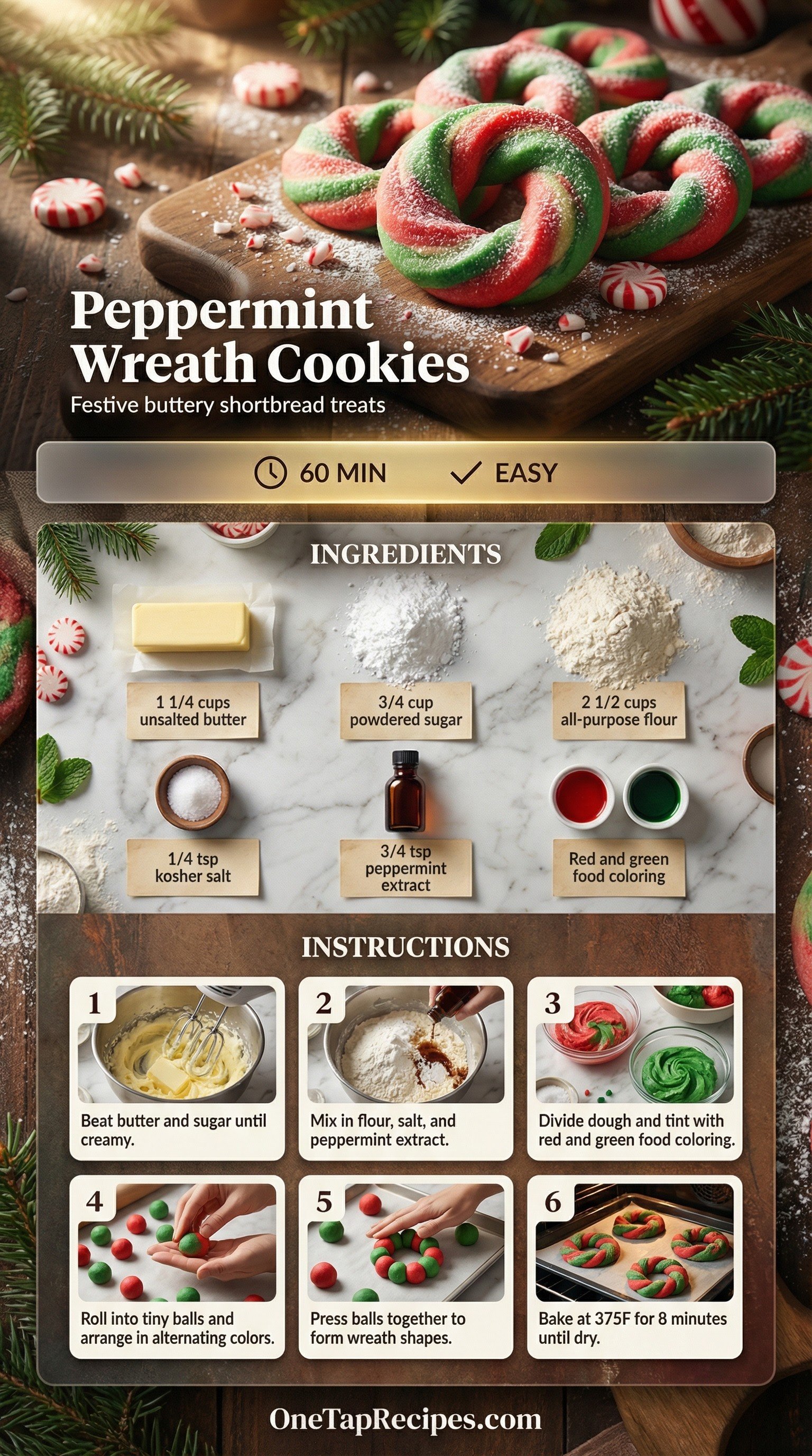 These festive peppermint wreath cookies are a buttery shortbread treat that practically dissolves in your mouth. The dough is divided and tinted with red and green food coloring, then rolled into tiny balls and pressed together to form a colorful holiday ring. Flavored with cool peppermint extract, they are a fun and beautiful addition to any winter cookie tin or holiday dessert spread.