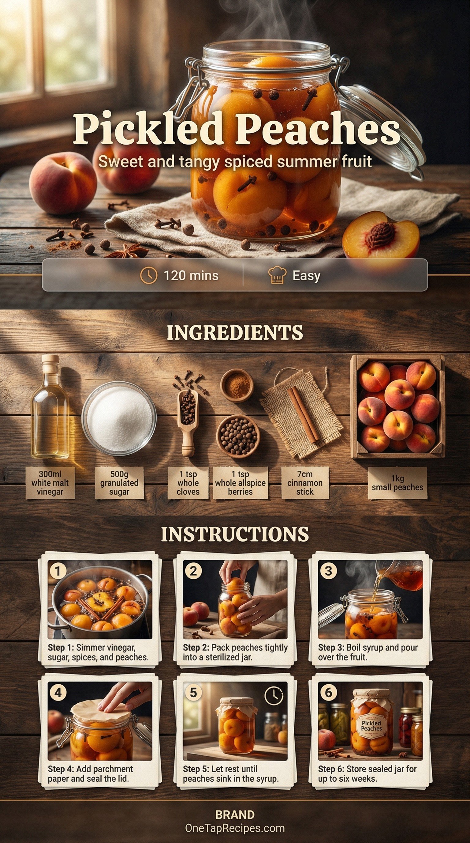 Capture the bright, sweet, and tangy essence of summer fruit to enjoy during the colder months. These quick pickled peaches combine a spiced malt vinegar syrup with warm notes of cinnamon, cloves, and allspice. The fruit gently simmers until just tender, creating a firm texture that holds up beautifully in the jar. Serve them alongside rich meats like roast pork or duck, or add them to a cheese board for a sharp, sweet contrast.