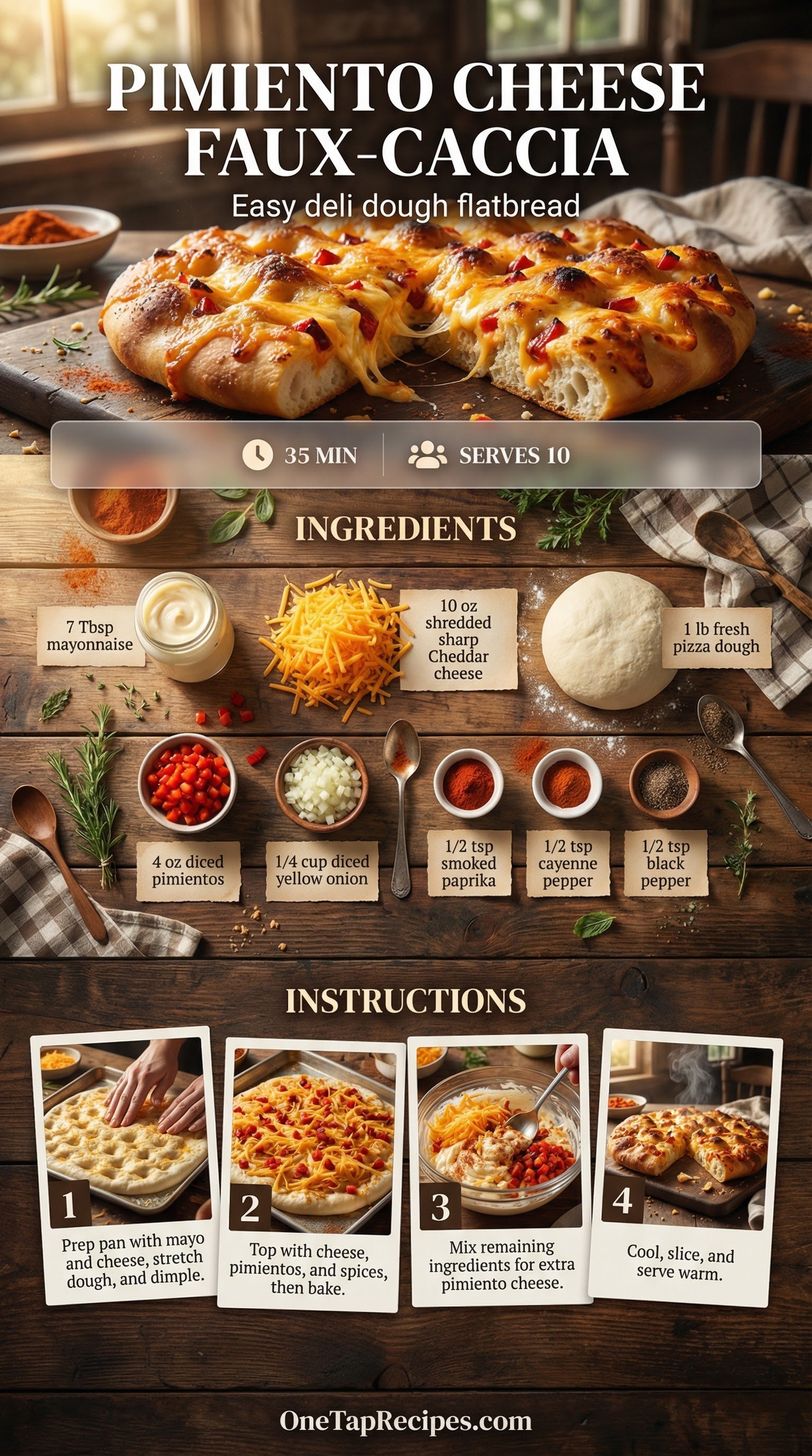 Transform store-bought pizza dough into a savory, Southern-inspired flatbread with minimal effort. This clever shortcut mimics the dimpled texture of traditional focaccia but packs the bold flavors of classic pimiento cheese. Sharp cheddar, diced pimientos, and a hint of cayenne pepper melt into the dough as it bakes to a golden brown. A layer of mayonnaise underneath the crust ensures a crisp, rich bottom that releases easily from the pan. Serve it warm as a comforting appetizer for your next gathering or alongside a hearty bowl of soup.