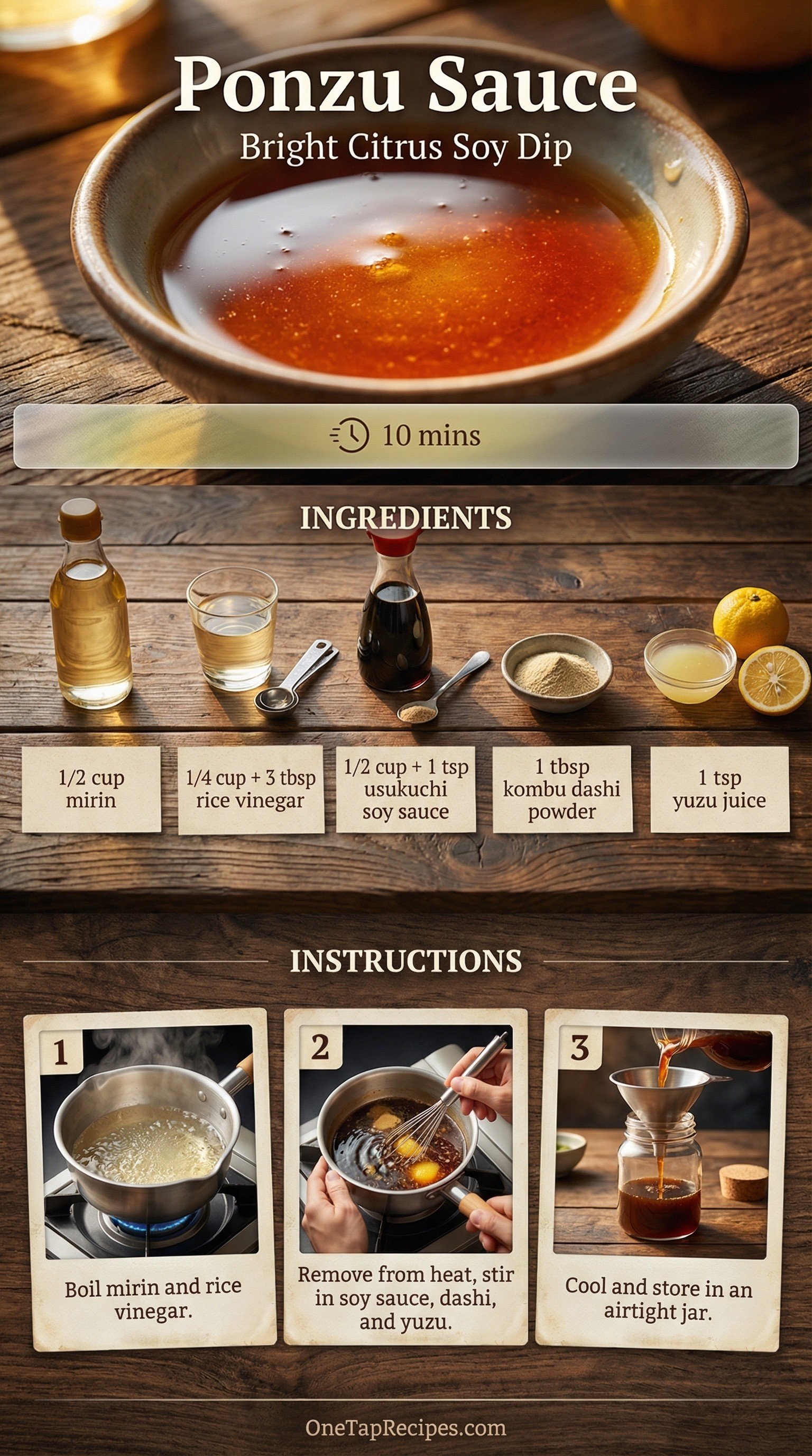 Bright, citrusy, and deeply savory, this classic Japanese dipping sauce cuts through rich foods beautifully. You'll only need a handful of pantry staples like mirin, rice vinegar, and kombu dashi powder to pull it together. A splash of yuzu juice brings a distinct, floral acidity that wakes up everything it touches. Keep a jar tucked in your fridge to serve alongside dumplings, grilled fish, or hot pot meals. It's a massive upgrade from store-bought bottles.