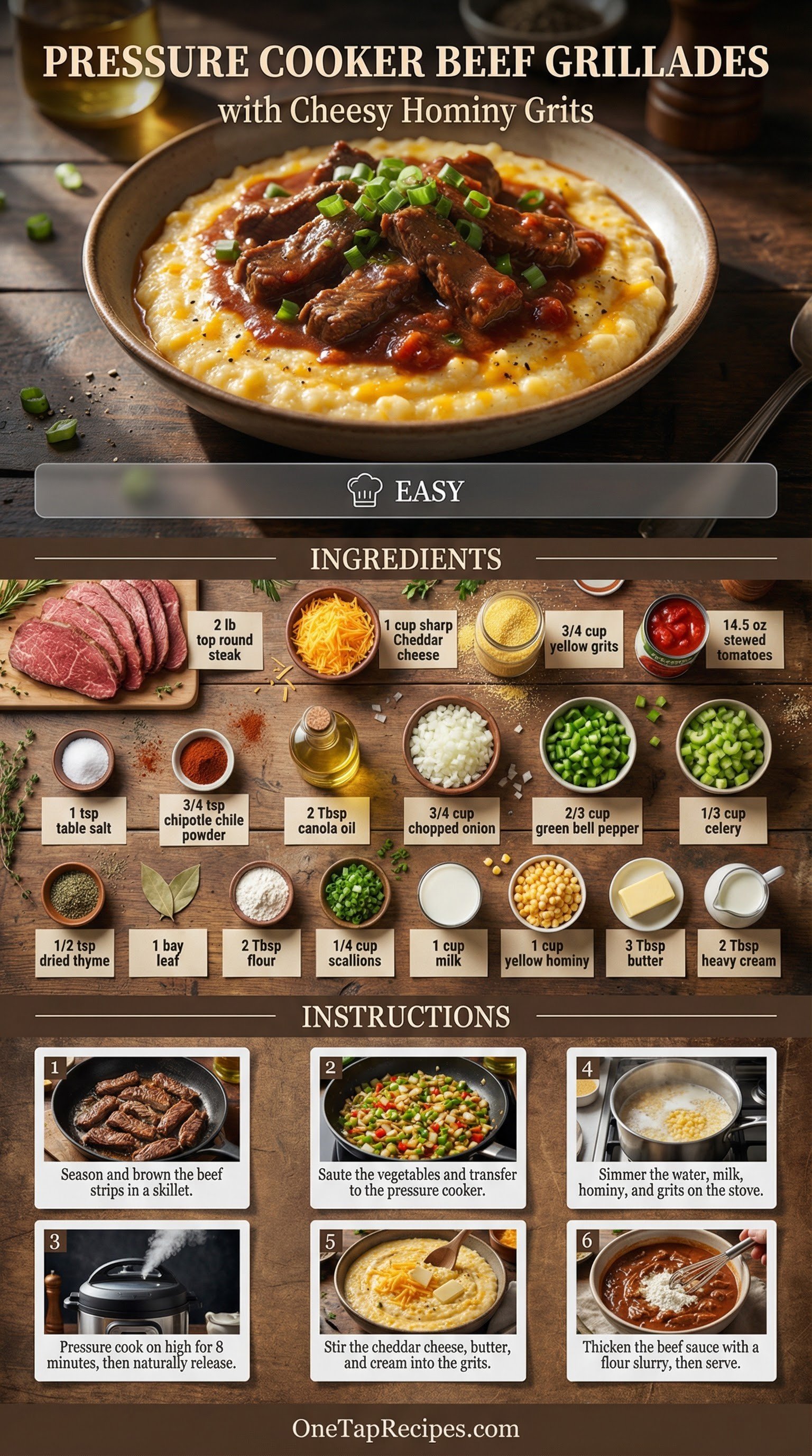 A hearty Southern-inspired meal featuring tender beef grillades cooked in a pressure cooker, served over creamy, cheesy hominy grits. Using a multicooker drastically cuts down the cooking time for the beef, while the stovetop grits simmer to a rich, comforting texture. The smoky chipotle chile powder and savory stewed tomatoes create a robust sauce that pairs perfectly with the sharp cheddar and heavy cream in the grits. It is an excellent choice for a cozy weekend dinner.