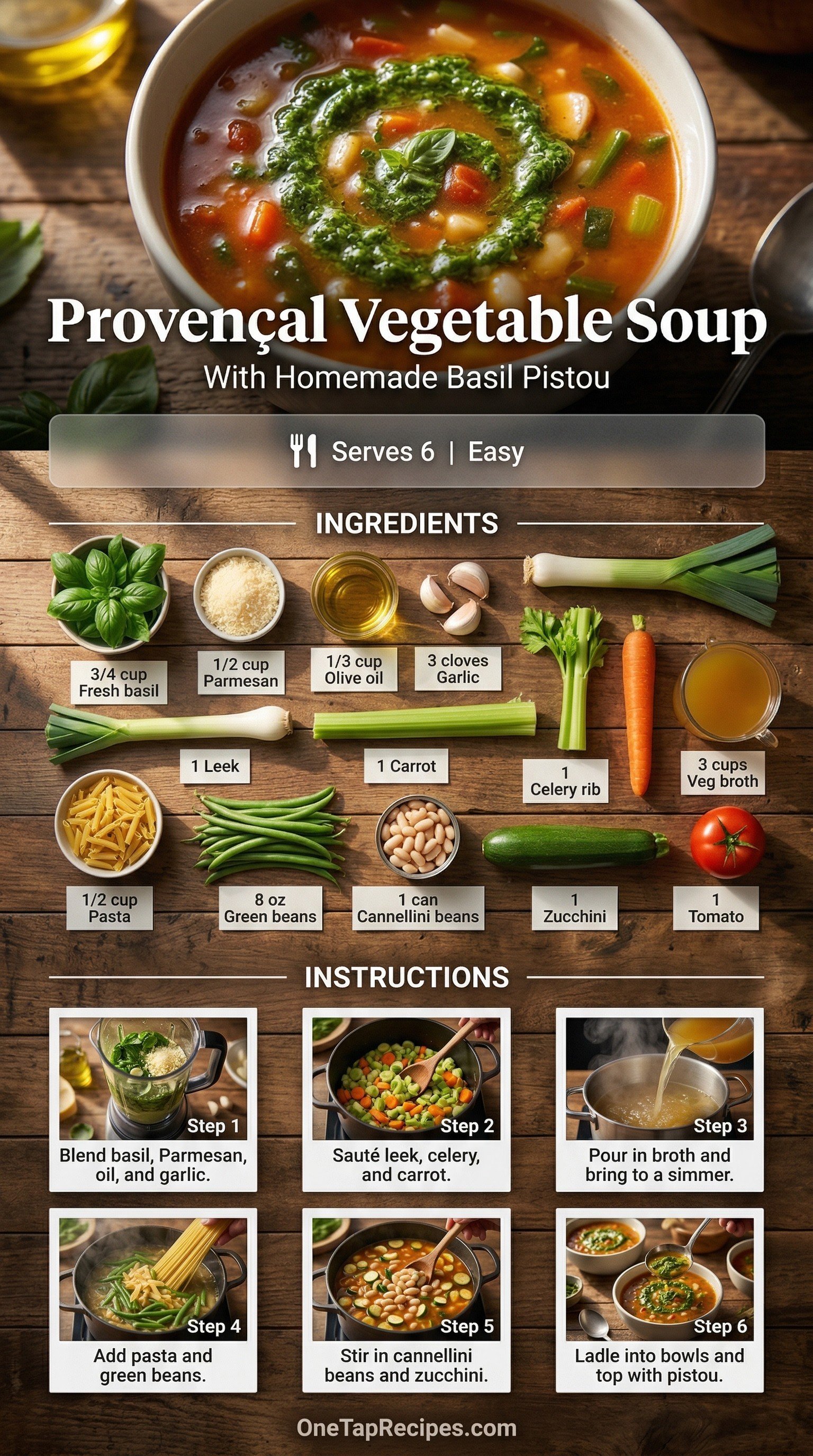1. 1Blend the fresh basil, grated Parmesan, one-third cup of olive oil, and one minced garlic clove in a food processor until smooth to create the pistou, then set it aside. In a large pot, heat a tablespoon of olive oil over medium heat and cook the sliced leek, celery, carrot, and a pinch of salt for 8 to 10 minutes until soft. Stir in the remaining minced garlic for 30 seconds, then pour in the vegetable broth and three cups of water. Bring the liquid to a simmer, add the pasta, and cook for 5 minutes. Toss in the green beans and simmer for another 3 to 5 minutes until they are bright green but still crisp.