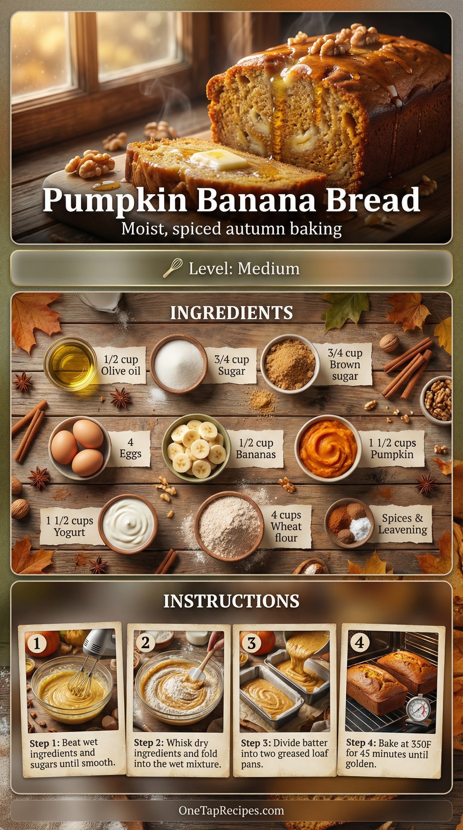 This wholesome quick bread brings together the best parts of two classic baking favorites. Mashed ripe bananas and rich pumpkin puree create an incredibly moist crumb, while a blend of cinnamon, ginger, and nutmeg adds deep autumn warmth. Using whole wheat flour and olive oil gives the loaves a hearty texture and rich flavor without feeling heavy. It is a perfect baking project for a crisp weekend morning or a comforting afternoon snack with coffee. The recipe yields two generous loaves, so you can enjoy one right away and save the other for later.