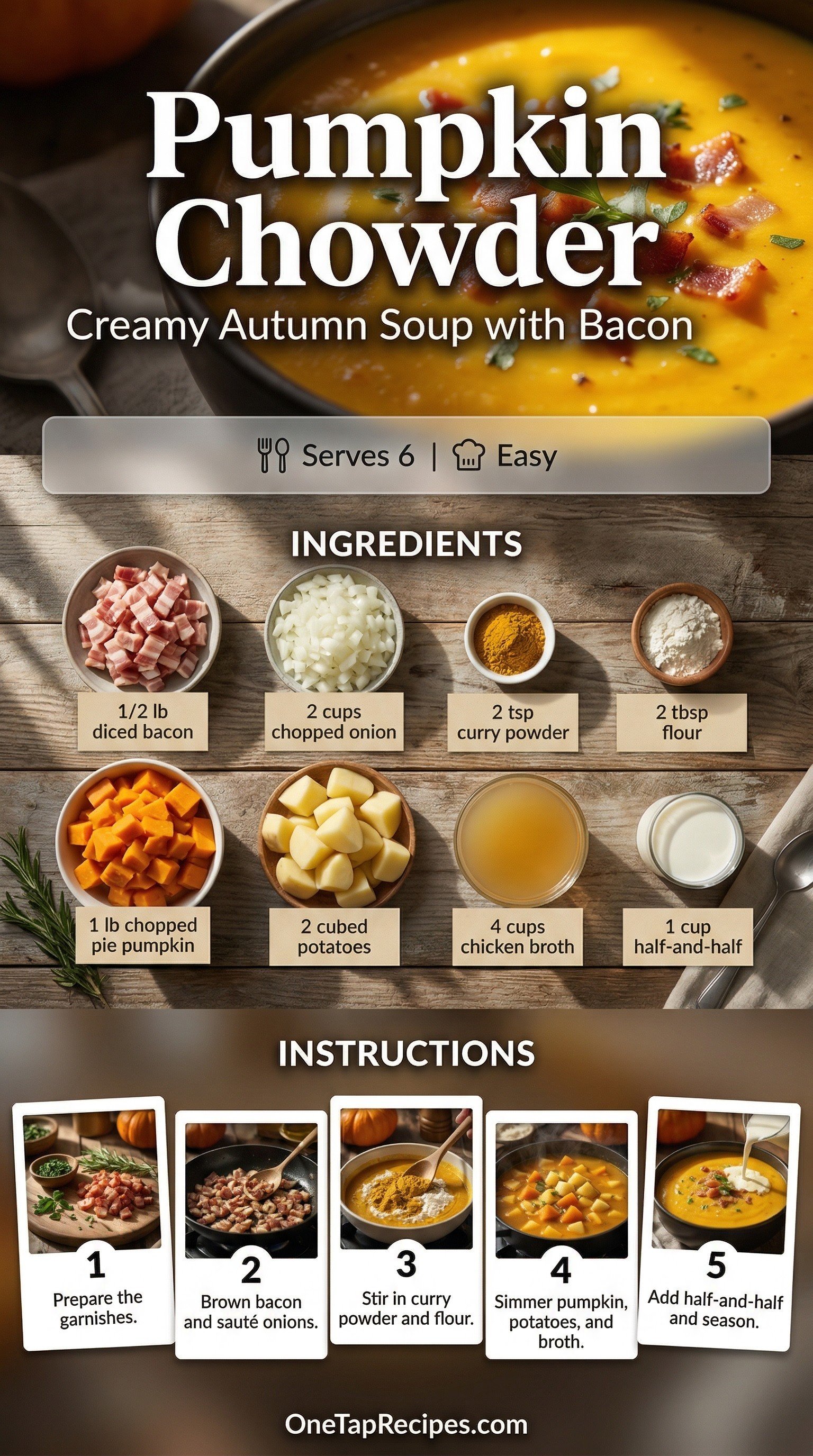 This creamy pumpkin chowder combines savory diced bacon, tender potatoes, and fresh pie pumpkin for a deeply comforting bowl of soup. A touch of curry powder adds a warm, earthy spice that perfectly balances the rich half-and-half and chicken broth base. It comes together easily on the stovetop, making it a great choice for a cozy weeknight dinner during the crisp autumn months. Serve it hot with toasted pumpkin seeds and sliced green onions for added crunch.