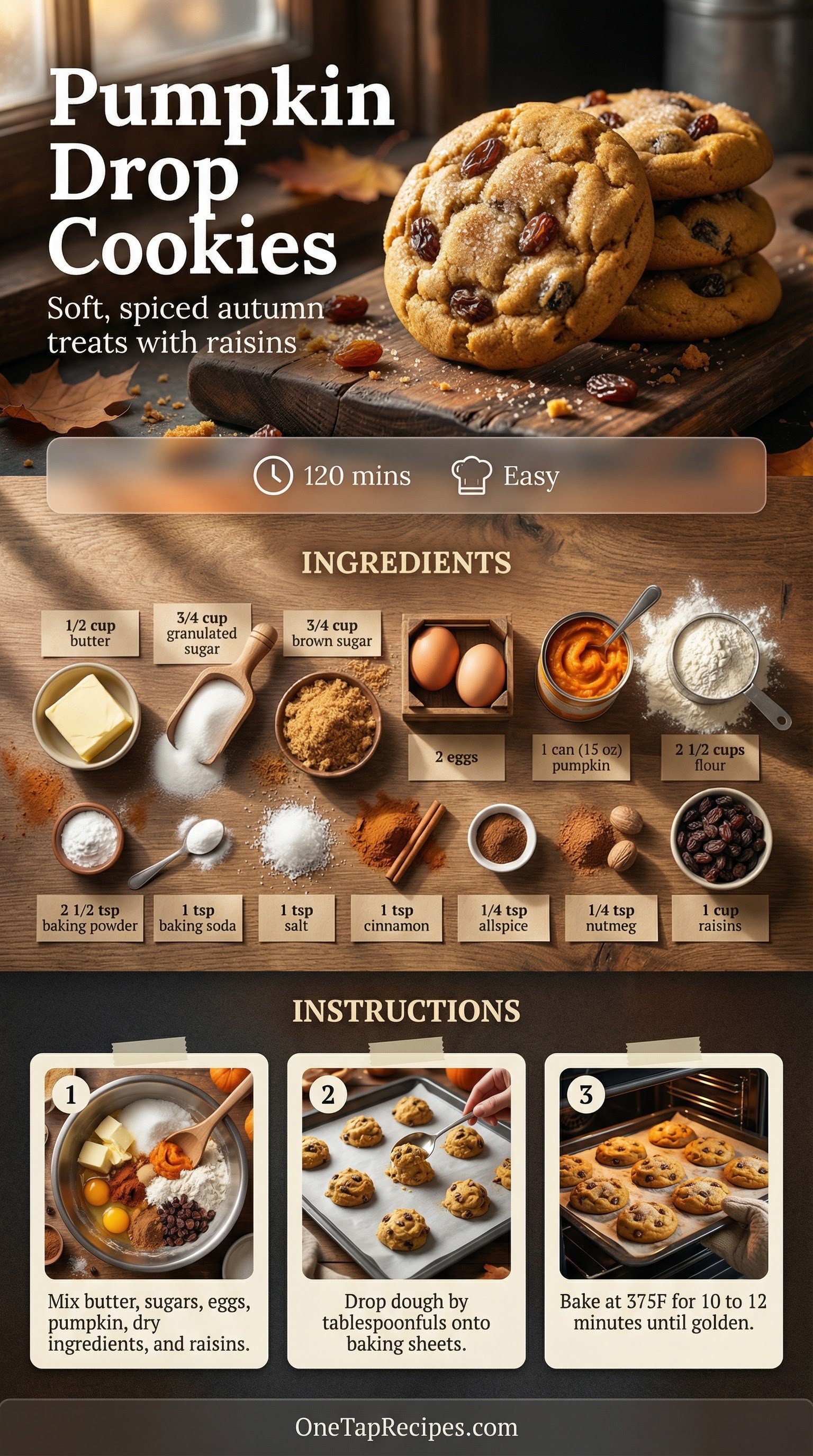 Soft, spiced pumpkin drop cookies studded with sweet raisins bring the best flavors of autumn to your kitchen. These treats use a full can of pure pumpkin to create a tender, cake-like texture that melts in your mouth. Warm cinnamon, nutmeg, and allspice blend perfectly with rich brown sugar for a deeply comforting bite. They are quick to mix up and make a wonderful addition to any fall gathering or a cozy afternoon coffee break.