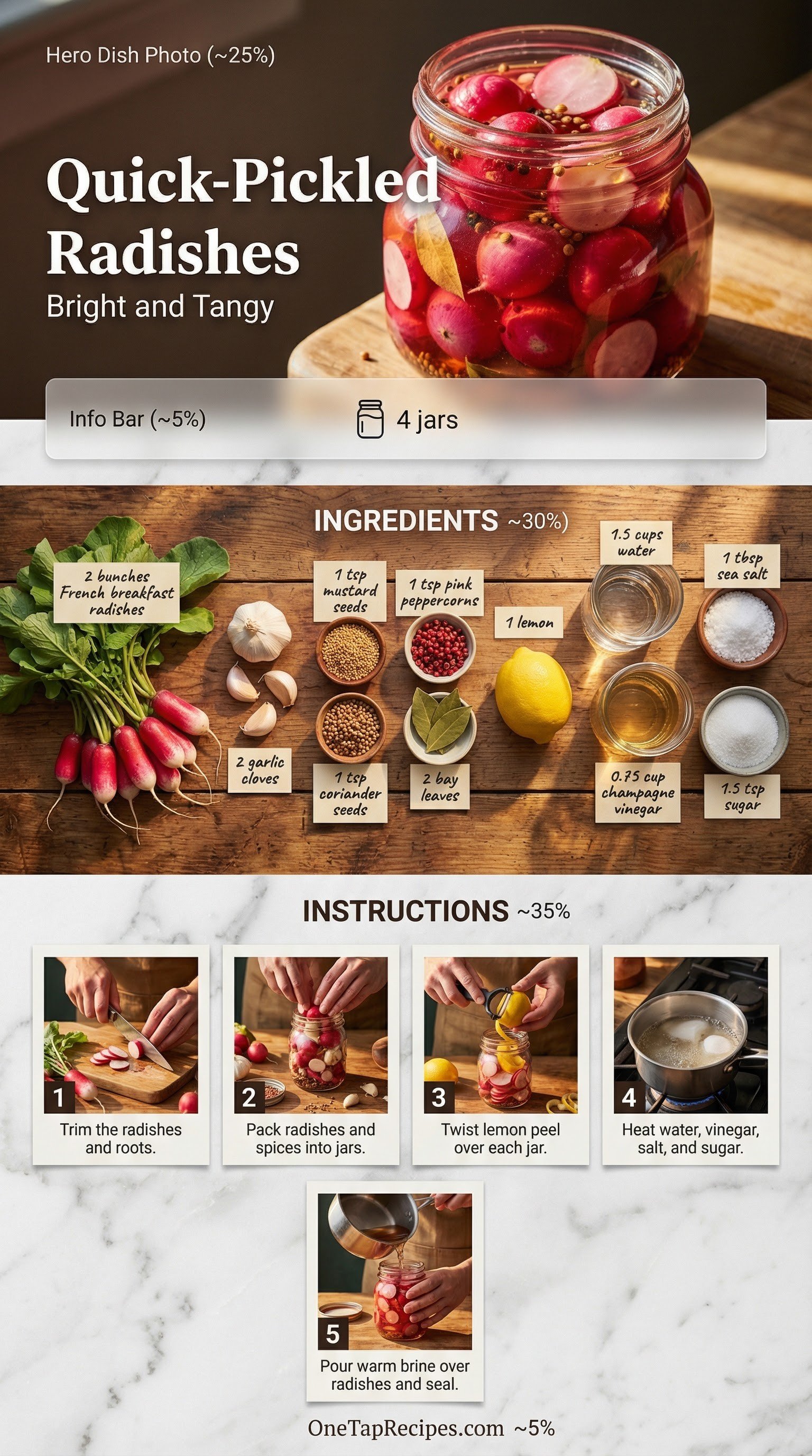 These quick-pickled French breakfast radishes offer a bright, tangy bite with a satisfying crunch. A delicate brine of champagne vinegar, pink peppercorns, and fresh lemon peel complements the natural pepperiness of the radishes. Keep a jar in the fridge to instantly upgrade your avocado toast, tacos, or charcuterie boards. The garlic and coriander seeds add a savory depth that balances the crisp, acidic finish.