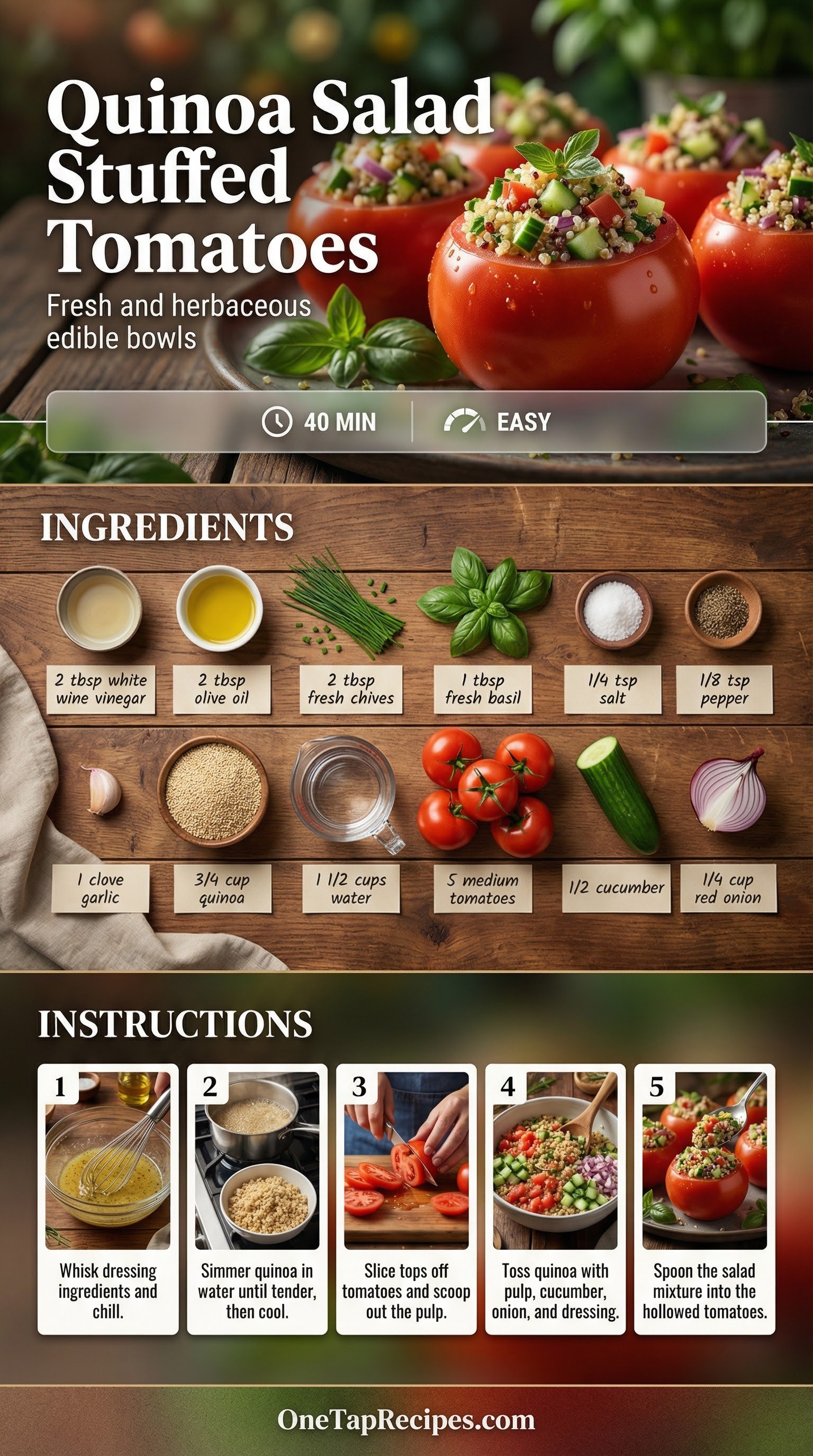Fresh tomatoes serve as edible bowls for a bright, herb-packed quinoa salad. This dish combines fluffy cooked quinoa with crisp cucumbers, sharp red onion, and the scooped-out tomato pulp. A simple homemade vinaigrette made with white wine vinegar, fresh basil, and chives brings everything together. It is a light, refreshing option for a warm weather lunch or a colorful side dish at your next dinner party. The presentation looks impressive but requires very little effort to pull off.