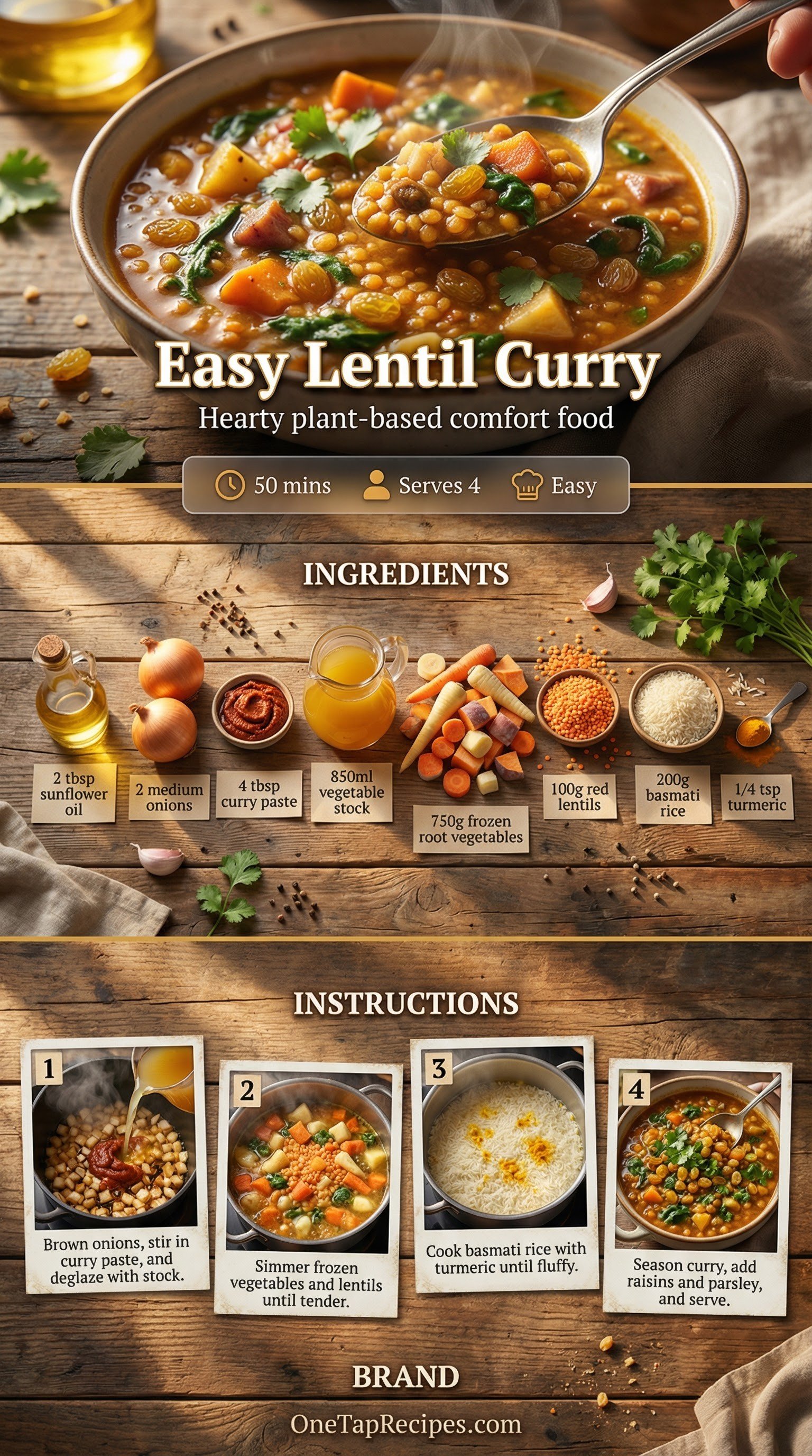 Earthy red lentils and sweet root vegetables melt together in this rich, spiced broth. Using frozen vegetables and prepared curry paste keeps the prep work incredibly light, but you'll still get deep, complex flavor. As they simmer, the lentils break down to naturally thicken the sauce, so it's a wonderfully comforting stew. A handful of sweet raisins and fresh parsley stirred in at the end provides a bright contrast to the warm spices. Serve it over turmeric-scented basmati rice for a satisfying, warming meal.