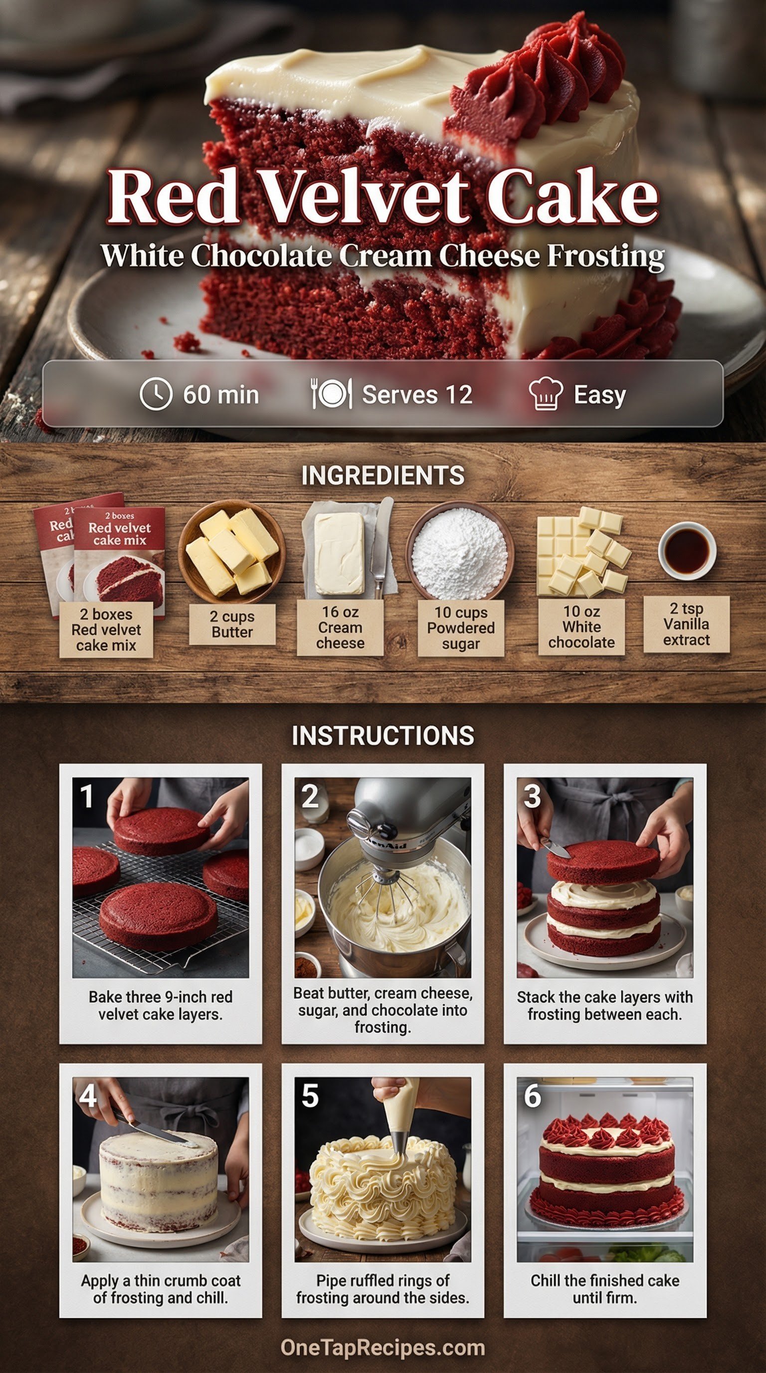 A classic Southern red velvet cake pairs with a rich white chocolate cream cheese frosting. Using boxed cake mix keeps the preparation simple while delivering a soft crumb. The homemade frosting adds a sweet, creamy finish that makes this dessert a great choice for holidays or weekend celebrations. You can pipe the frosting into a ruffled design or keep it smooth for a casual look.