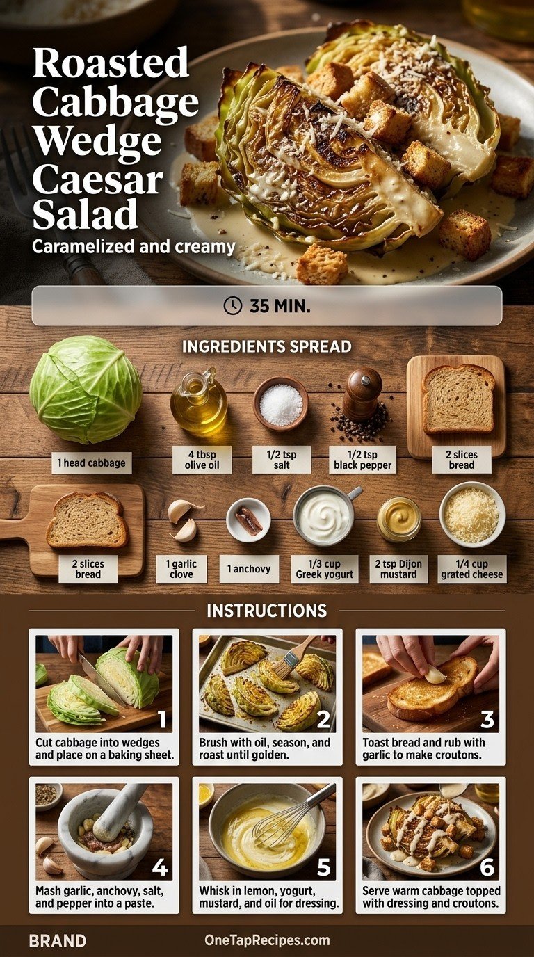 Roasting transforms ordinary green or red cabbage into something truly special. The high heat of the oven caramelizes the natural sugars, creating a texture that is perfectly balanced between tender and crisp. This dish reimagines the classic wedge salad by pairing warm, charred cabbage with a punchy homemade Caesar dressing. A blend of Greek yogurt, Dijon mustard, and savory anchovy brings a bright, creamy finish to the plate. Serve these hearty wedges as a satisfying starter or a light main course for your next dinner.