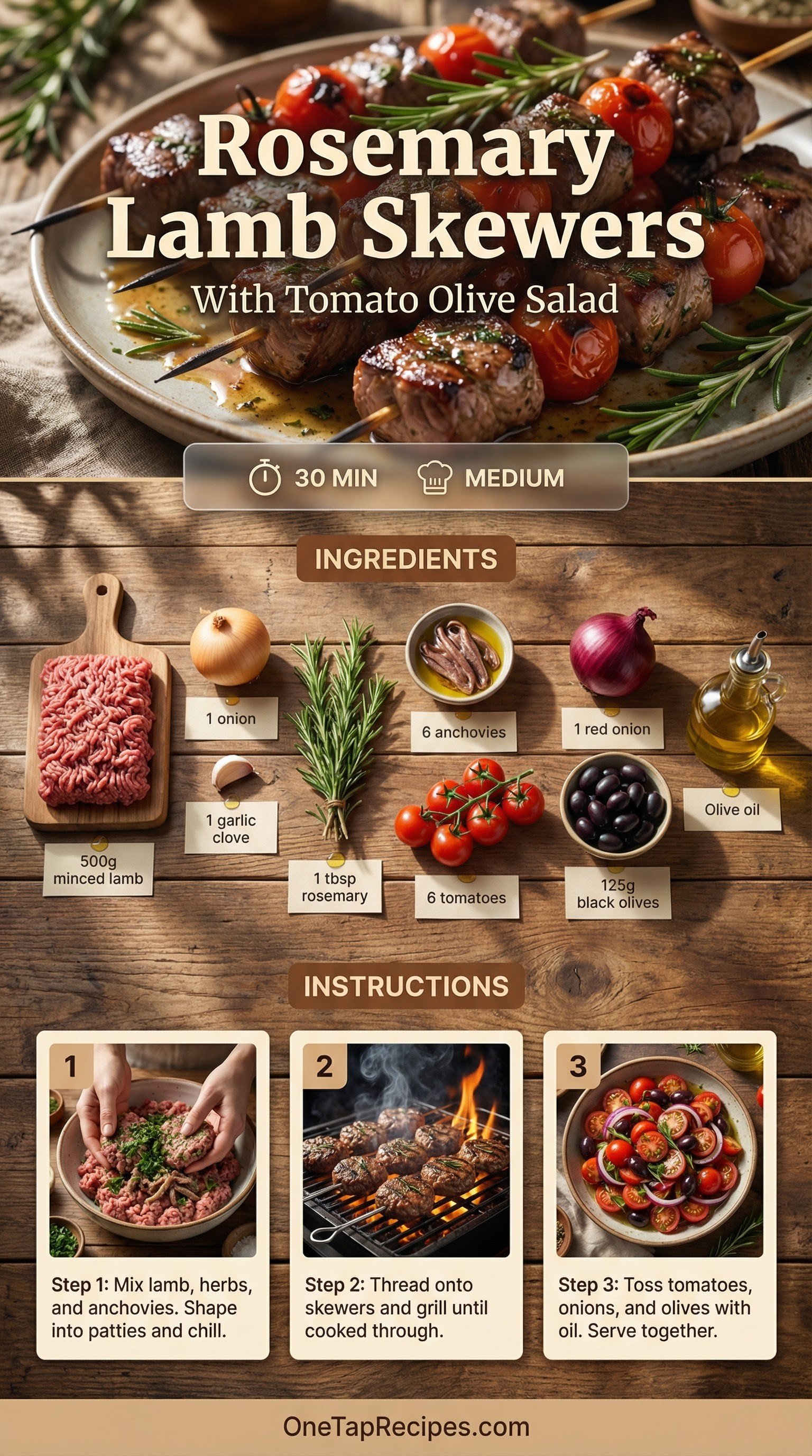Minced lamb gets a savory upgrade with fresh rosemary and chopped anchovies in these quick grilled skewers. The anchovies melt into the meat as it cooks, adding a deep, salty richness that pairs perfectly with the bright tomato and olive salad served alongside. These sausage-shaped patties are ideal for a fast weeknight dinner or a casual weekend barbecue. Serve them straight off the grill for a satisfying meal with bold Mediterranean flavors.