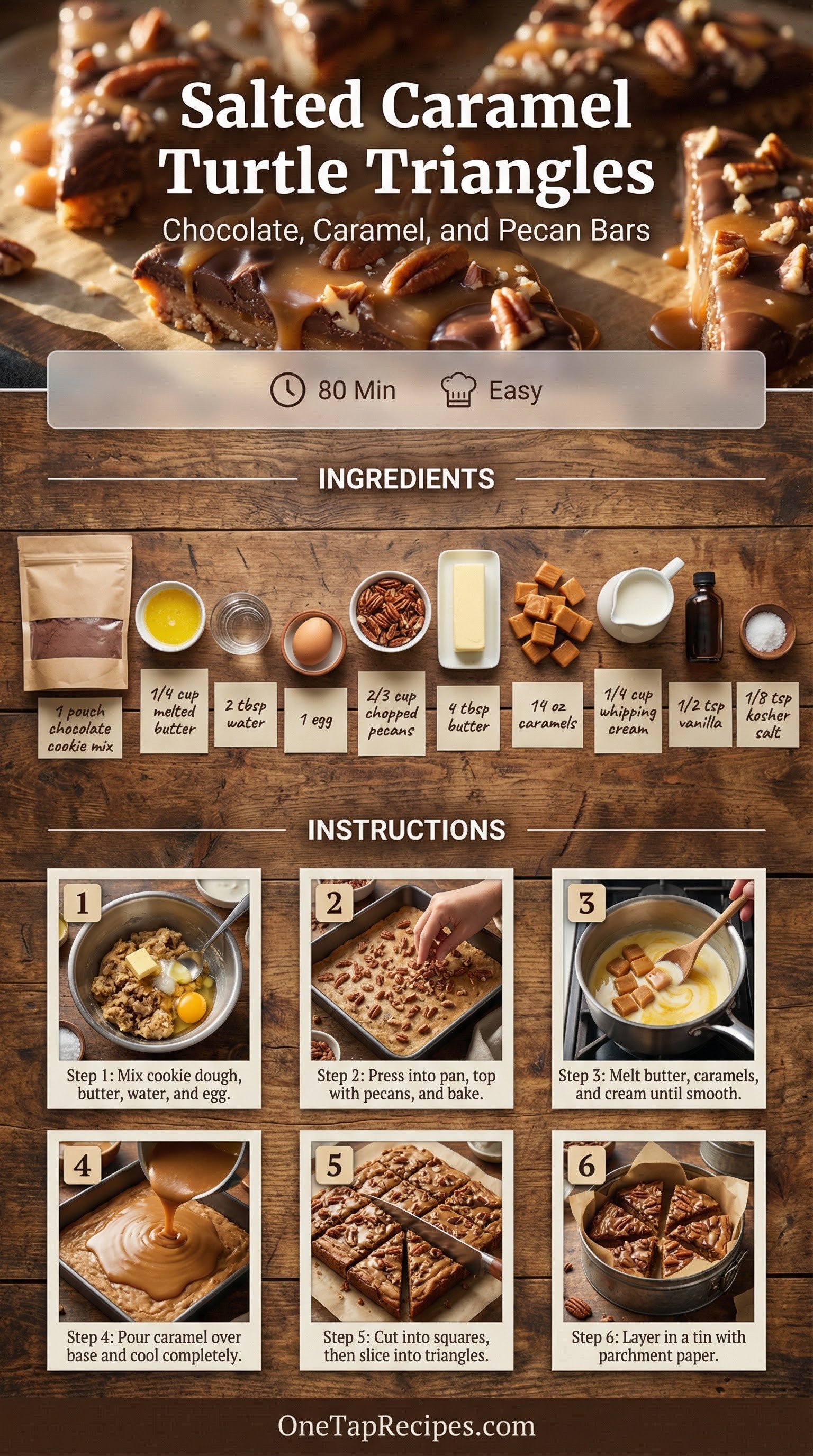 These salted caramel turtle triangles combine a rich chocolate base with a gooey caramel and pecan topping. Using a packaged double chocolate chunk cookie mix keeps the preparation fast and straightforward. The melted caramel layer gets a boost from heavy whipping cream and a generous pinch of coarse kosher salt to balance the sweetness. They are an excellent choice for holiday cookie tins or casual weekend baking. The finished bars slice easily into neat triangles for sharing.