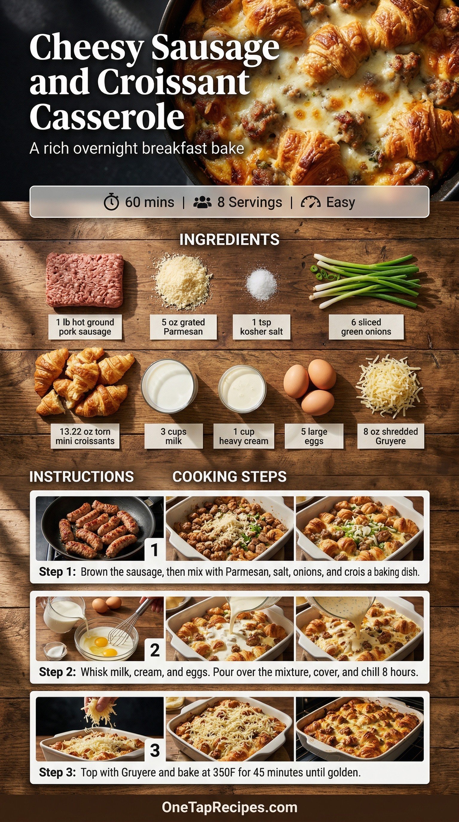 This savory overnight bake transforms torn mini croissants and hot ground pork sausage into a rich breakfast custard. Using buttery croissants instead of standard bread adds incredible flaky texture to every bite. The mixture soaks in a creamy blend of eggs, milk, and heavy cream, making morning preparation completely effortless. Packed with sharp Gruyere, salty Parmesan, and fresh green onions, it is an ideal choice for holiday mornings or weekend entertaining.
