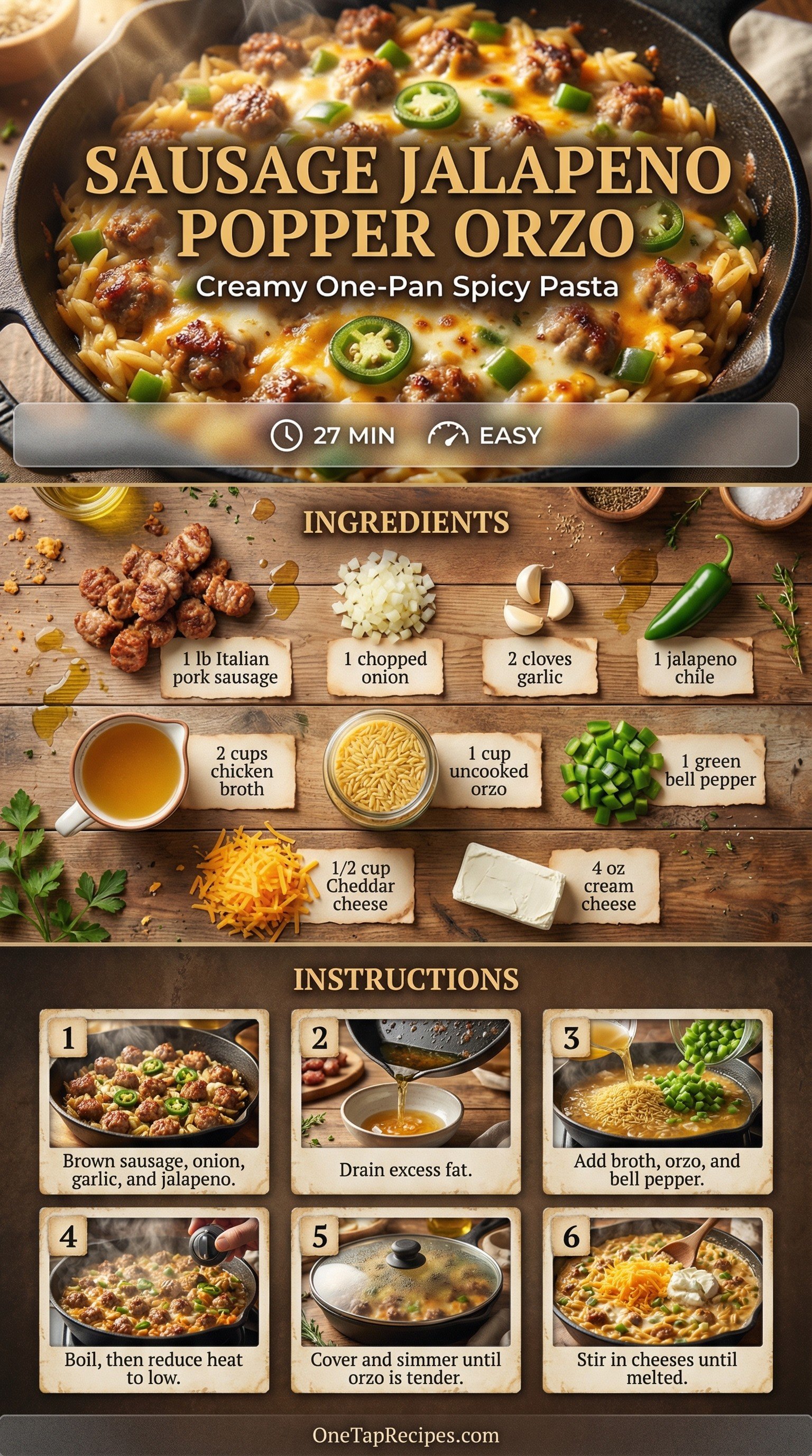 This creamy one-pan pasta combines savory Italian pork sausage, tender orzo, and fresh jalapenos. It captures the rich, cheesy flavor of a classic jalapeno popper in a quick skillet meal. Melted cheddar and cream cheese create a comforting, velvety sauce that coats every bite. It is a satisfying, spicy option for a busy weeknight.