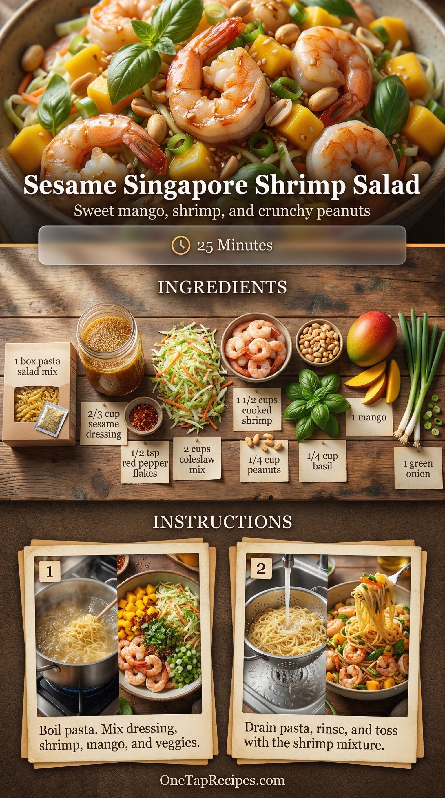 1Boil the pasta mix in a saucepan of water for 12 minutes, stirring occasionally. Meanwhile, in a large bowl, whisk together the included seasoning packet, sesame salad dressing, and crushed red pepper flakes. Fold in the coleslaw mix, chopped shrimp, peanuts, fresh basil, diced mango, and green onion until evenly coated.