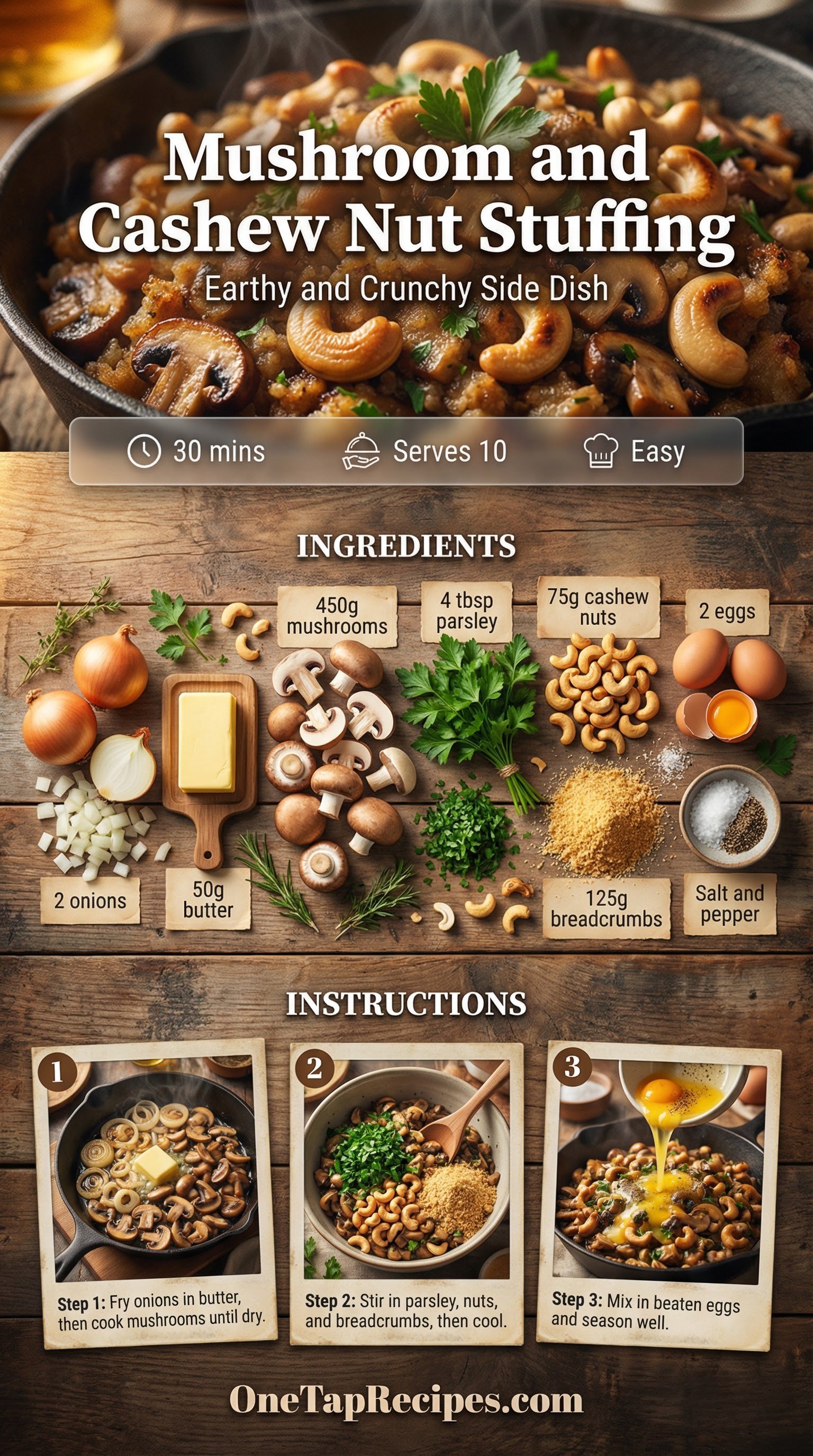 Earthy brown-cap mushrooms and toasted cashews give this vegetarian stuffing a deeply satisfying, meaty texture. You'll love how the rich, buttery onions build a savory base, while fresh parsley cuts through with a bright, herbal note. It's a comforting side that holds its own next to holiday roasts or a hearty Sunday dinner. Beaten eggs bind the fresh breadcrumbs together, ensuring every scoop is perfectly moist.