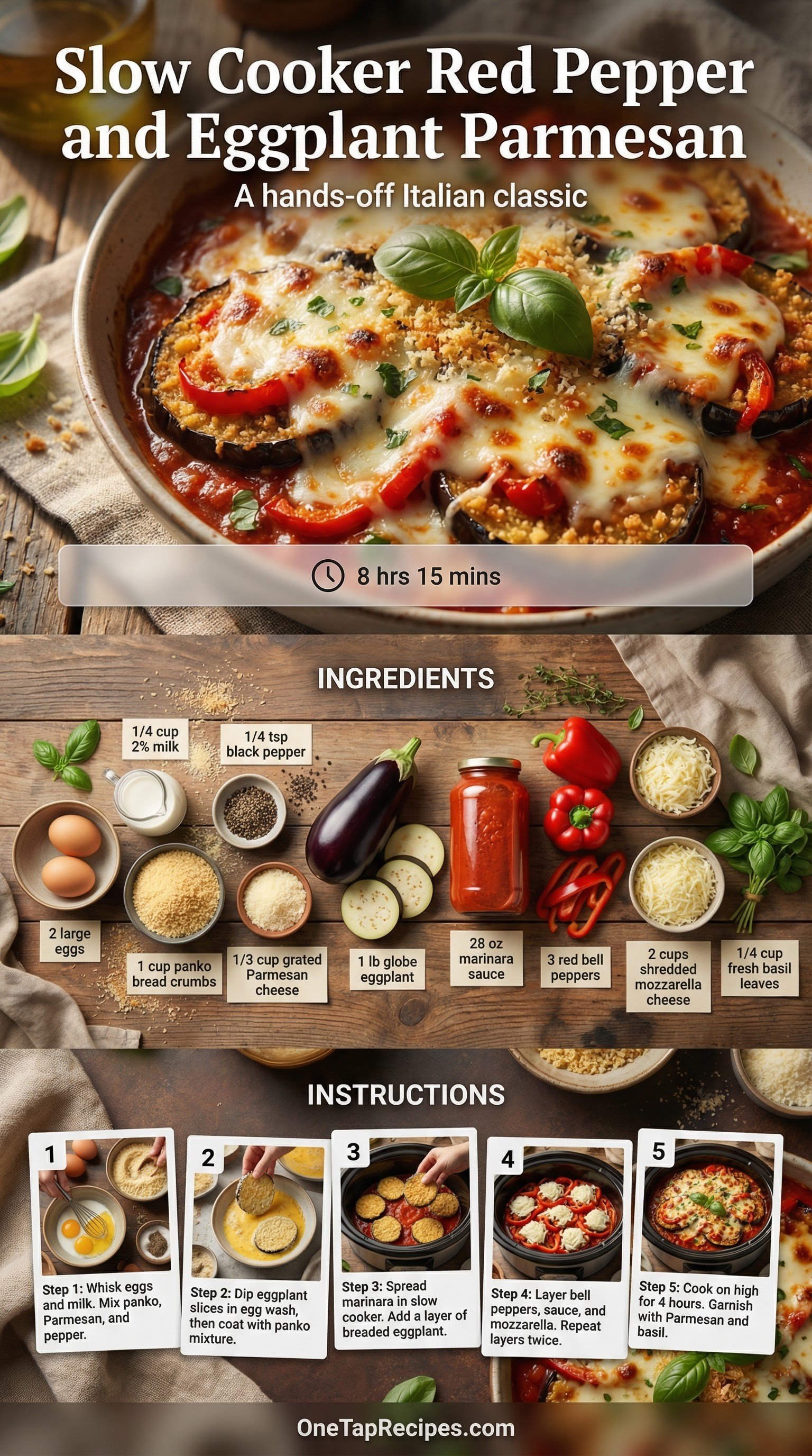 This slow cooker red pepper and eggplant Parmesan is a hands-off take on a classic Italian comfort food. Using a slow cooker transforms the vegetables into a silky, melt-in-your-mouth meal without the need to heat up your kitchen. It is an excellent choice for summer dinners when fresh produce is abundant at local markets. Layers of breaded eggplant, sweet bell peppers, and rich marinara sauce meld together under a blanket of melted mozzarella cheese.