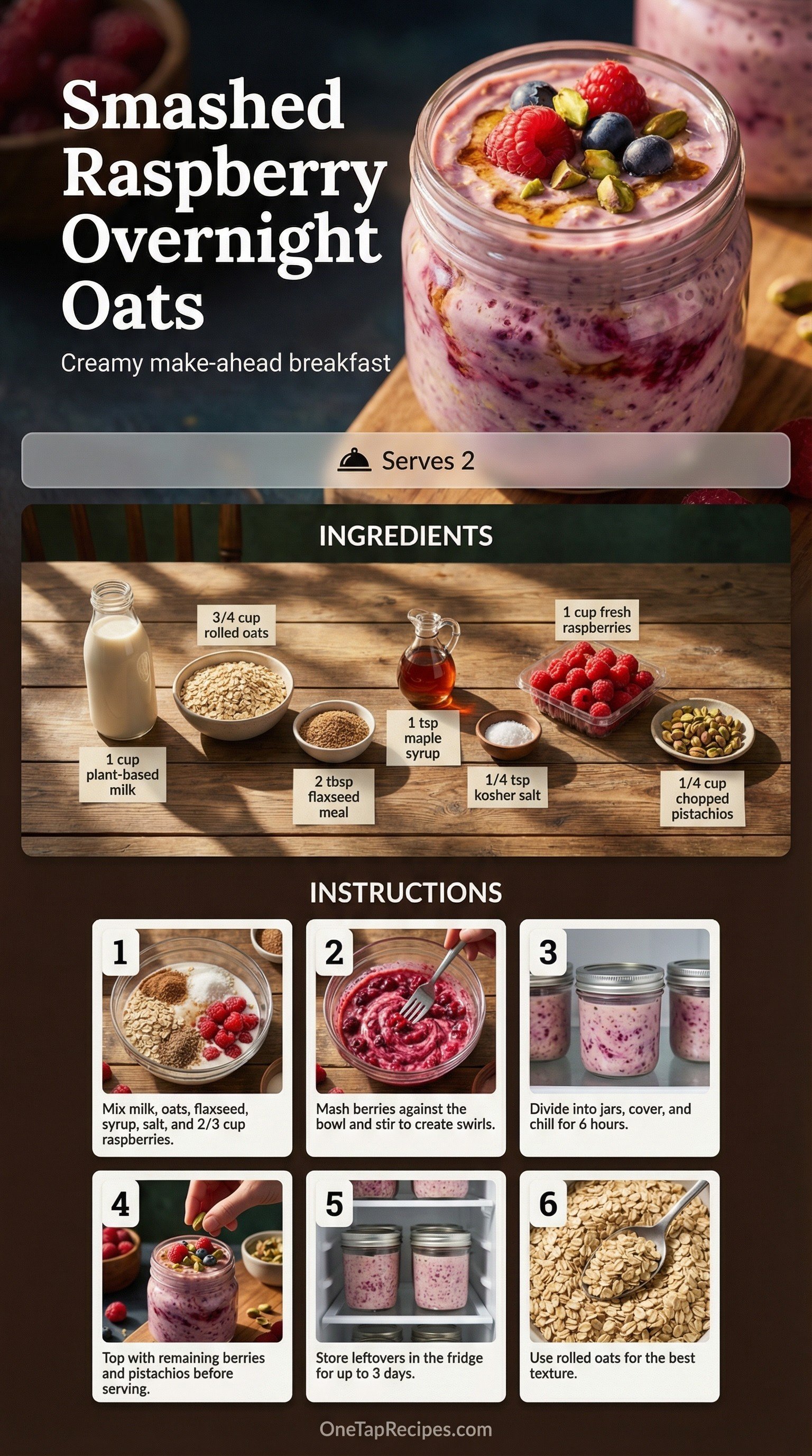Sweet, fresh raspberries get mashed directly into this creamy oat mixture, creating bright, fruity swirls that thicken as they chill. You'll love how the plant-based milk and flaxseed meal transform ordinary rolled oats into a rich, pudding-like breakfast while you sleep. Top the jars with chopped pistachios just before eating for a nutty, satisfying finish. It's a reliable, make-ahead morning meal that easily scales up for the whole family.