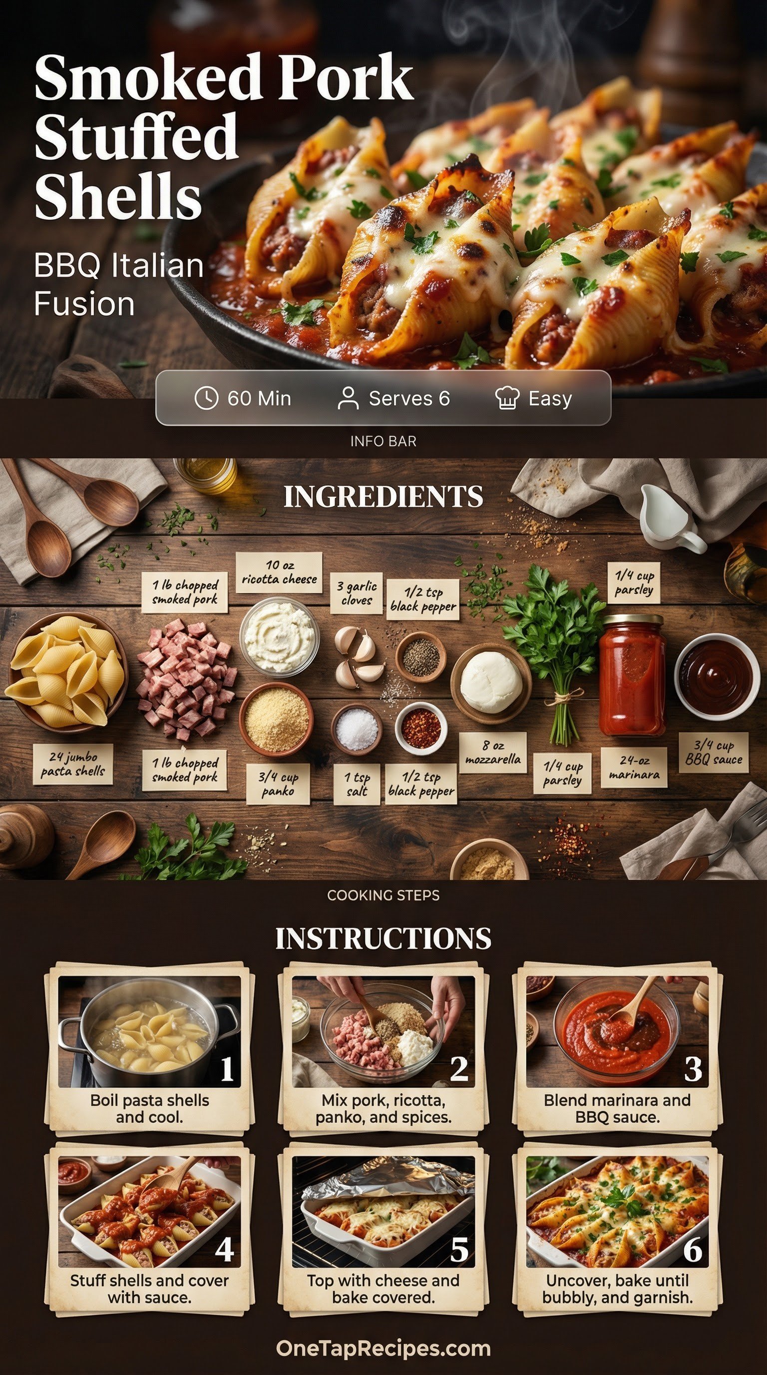 These jumbo pasta shells bring together classic Italian comfort and smoky barbecue flavors. The filling combines chopped smoked pork with creamy ricotta, garlic, and a blend of spices. A unique sauce made from marinara and barbecue sauce coats the bottom of the baking dish and covers the stuffed shells. Melted mozzarella finishes the dish for a rich, bubbly crust. It is a hearty dinner option that works well for casual weeknight meals or weekend gatherings.