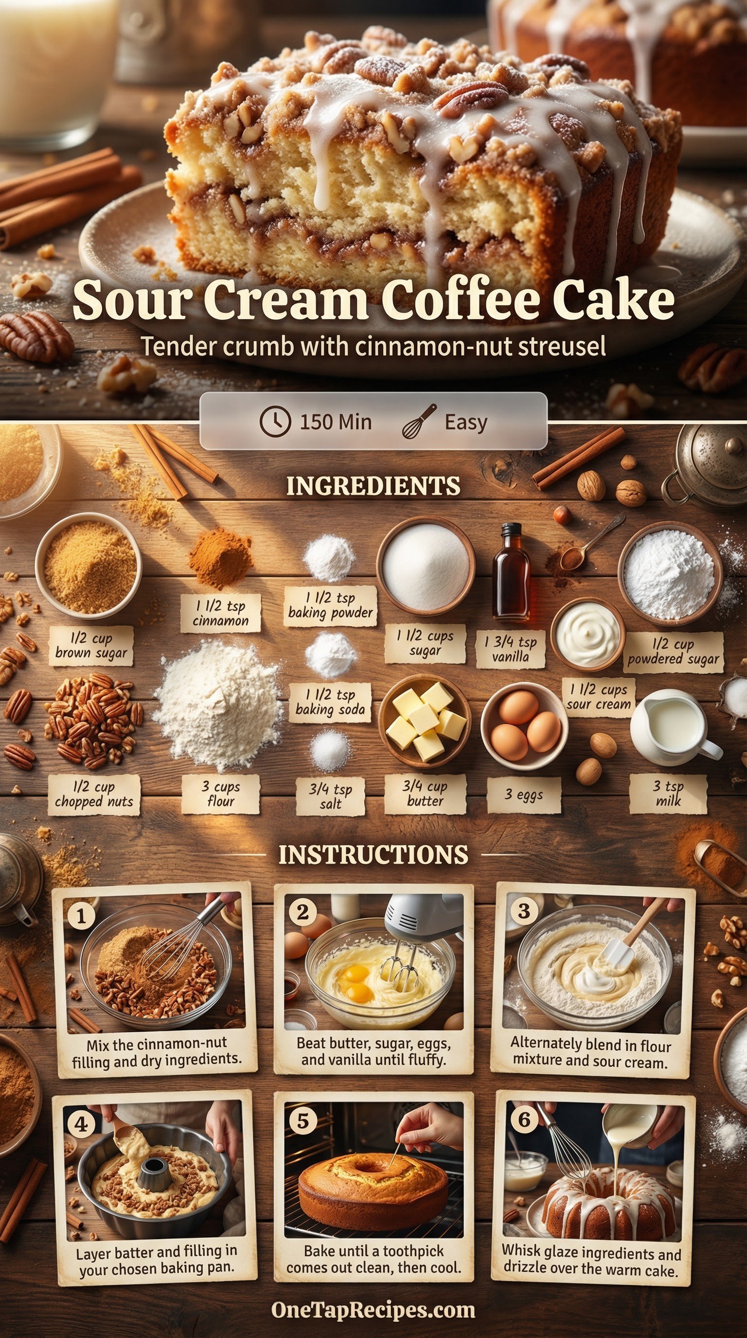 This classic sour cream coffee cake features a tender, rich crumb layered with a sweet cinnamon and nut streusel. The addition of sour cream keeps the batter incredibly moist while providing a subtle tang that balances the sweetness. A simple vanilla glaze drizzled over the top adds the perfect finishing touch. Serve this comforting cake warm for a weekend brunch or enjoy a slice with your afternoon coffee.