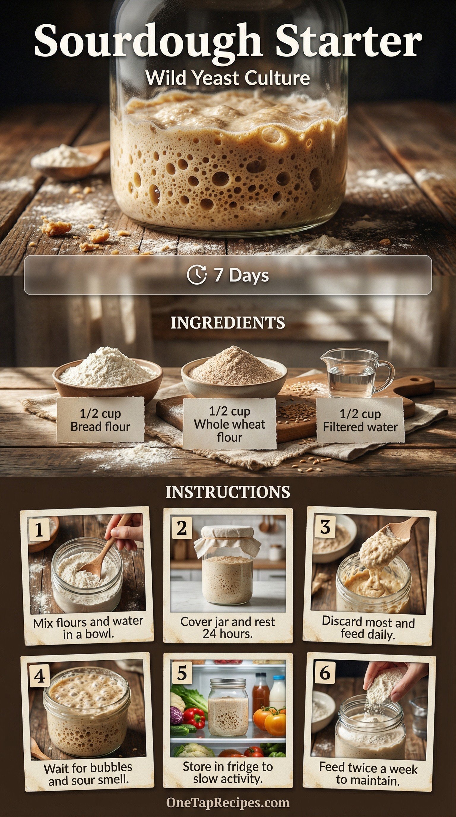 A reliable sourdough starter is the foundation of great homemade bread. This simple mixture of unbleached bread flour, whole wheat flour, and filtered water ferments over a week to create a robust wild yeast culture. The daily feeding process develops a complex, sweetly sour aroma and strong rising power. Once established, this active culture can live indefinitely in your refrigerator to leaven countless loaves of rustic sourdough.