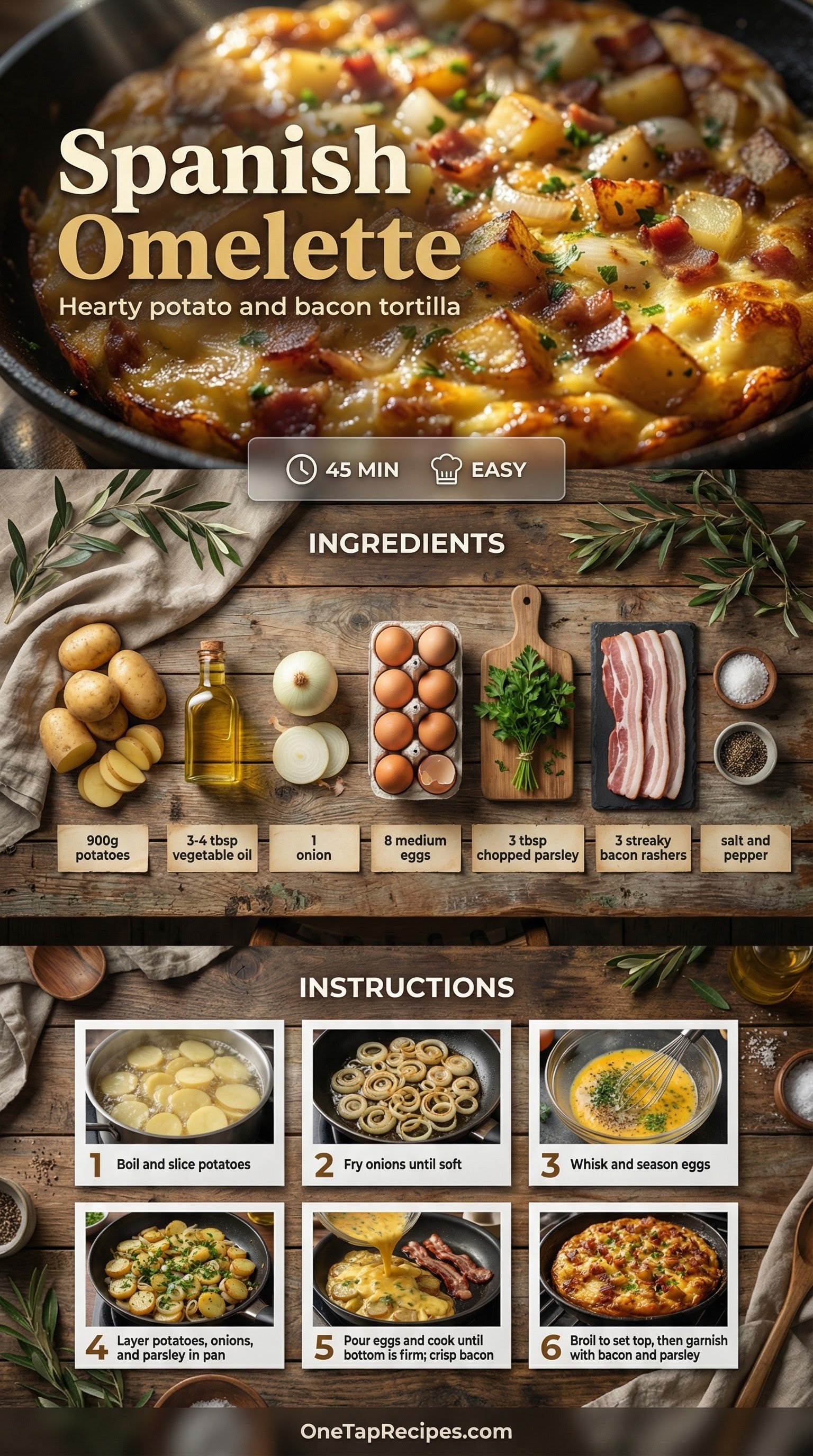 This hearty Spanish omelette is a comforting classic built on thick slices of tender potato and sweet caramelized onions. Crispy bacon and fresh flat-leaf parsley add savory depth and bright color to the rich egg base. It is an excellent choice for a relaxed weekend brunch or a simple weeknight dinner. The dish starts on the stovetop to build a golden crust and finishes under the broiler for a perfectly set top. Serve it warm or at room temperature alongside a crisp green salad.