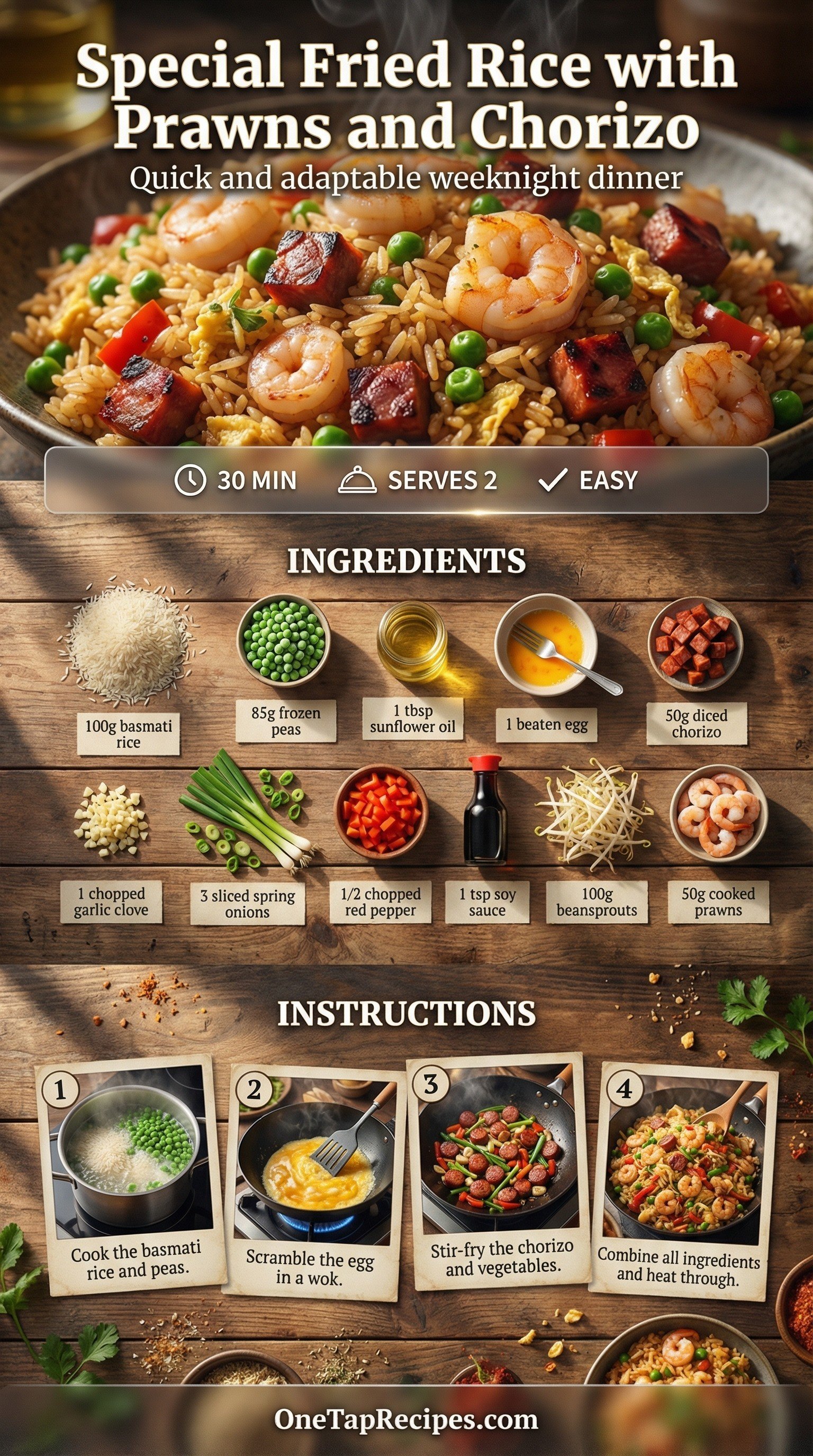 A quick and adaptable fried rice brings together savory chorizo and tender prawns for a satisfying meal. This dish uses simple pantry staples and leftover rice to create a flavorful weeknight dinner. The smoky notes of the chorizo pair perfectly with the bright crunch of fresh bell peppers and spring onions. You can easily customize the ingredients to suit your family, making it a reliable option for busy evenings.