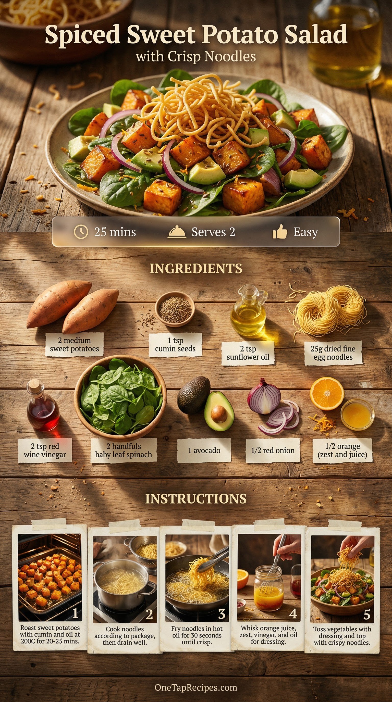 This colorful salad combines tender roasted sweet potatoes with the satisfying crunch of flash-fried egg noodles. Cumin seeds add a warm, earthy note that pairs perfectly with a bright orange and red wine vinegar dressing. Creamy avocado slices and fresh baby spinach round out the bowl, creating a beautiful contrast of textures and temperatures. It makes an excellent light lunch or a quick weeknight dinner when you want something fresh but filling.