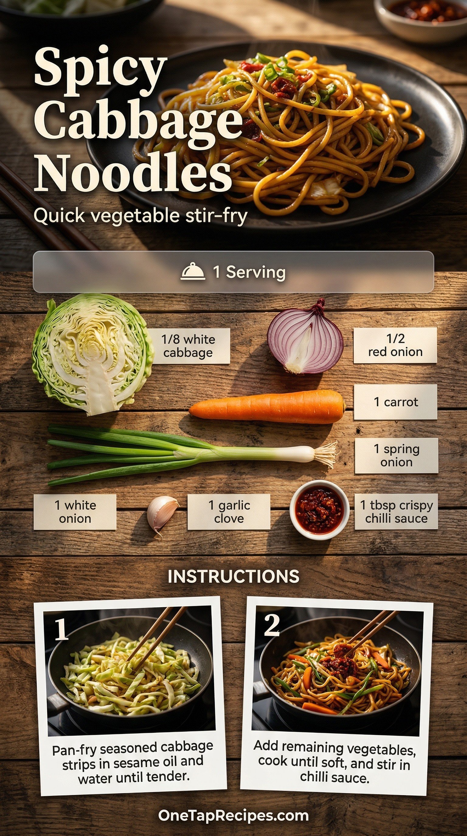Swap traditional pasta for fresh vegetables with these spicy stir-fried cabbage noodles. Cutting white cabbage into thin strips creates a perfect noodle substitute that cooks directly in the pan, saving you the trouble of boiling water. A savory mix of red onion, carrots, and garlic builds a fragrant base. Chinese crispy chili oil coats the tender cabbage ribbons, delivering a bold and fiery kick. It makes a fast, satisfying weeknight dinner or a quick vegetable-forward lunch.