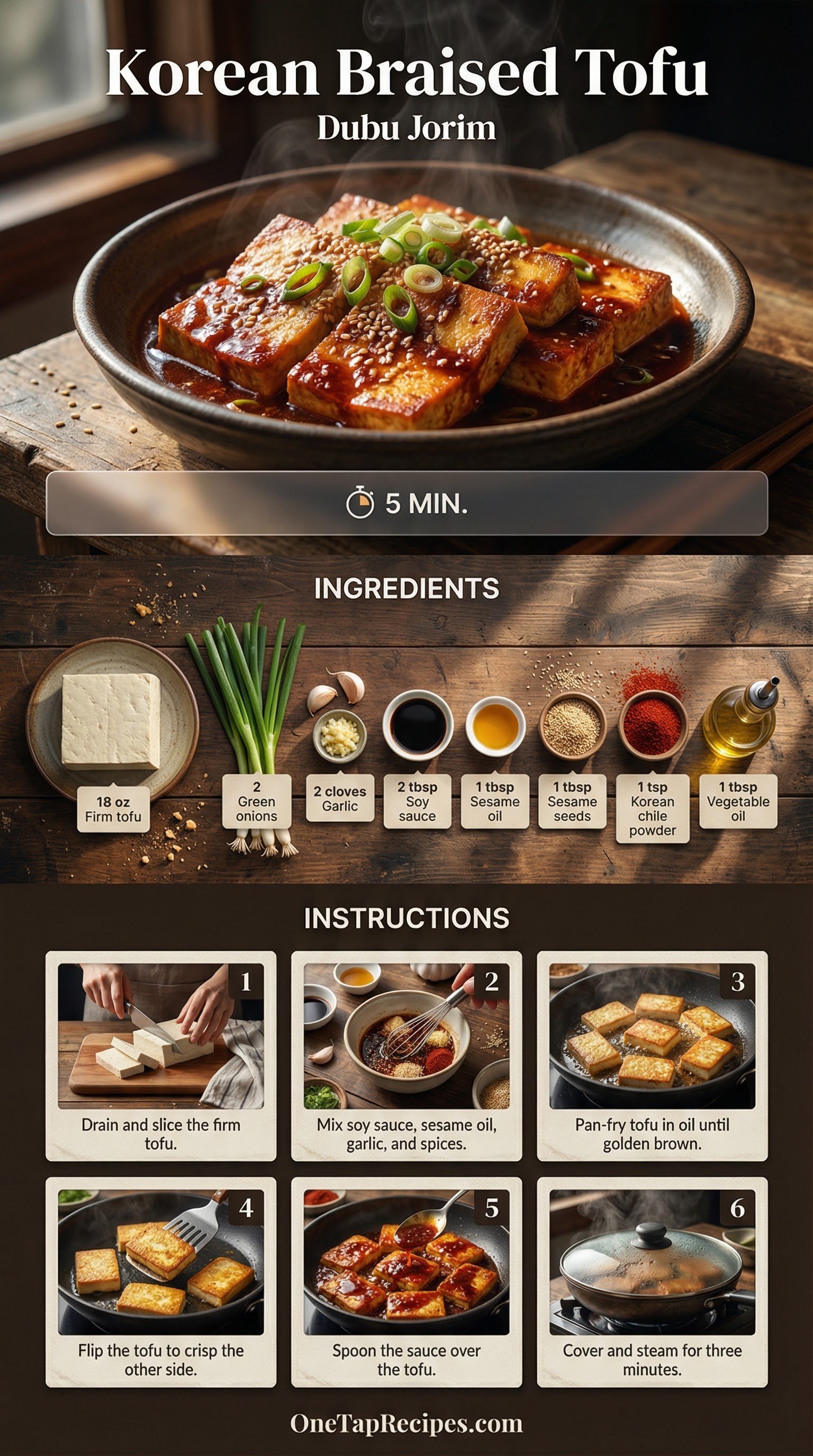 Crispy on the outside and impossibly tender within, this traditional Korean braised tofu transforms a plain block of soy into something spectacular. The tofu slices sear until golden before soaking up a deeply savory, spicy soy sauce packed with garlic and toasted sesame. It's a high-protein main that pairs beautifully with a simple bowl of steamed rice. You'll love how the edges catch the rich glaze, making it a dish you'll crave long after the plates are cleared.