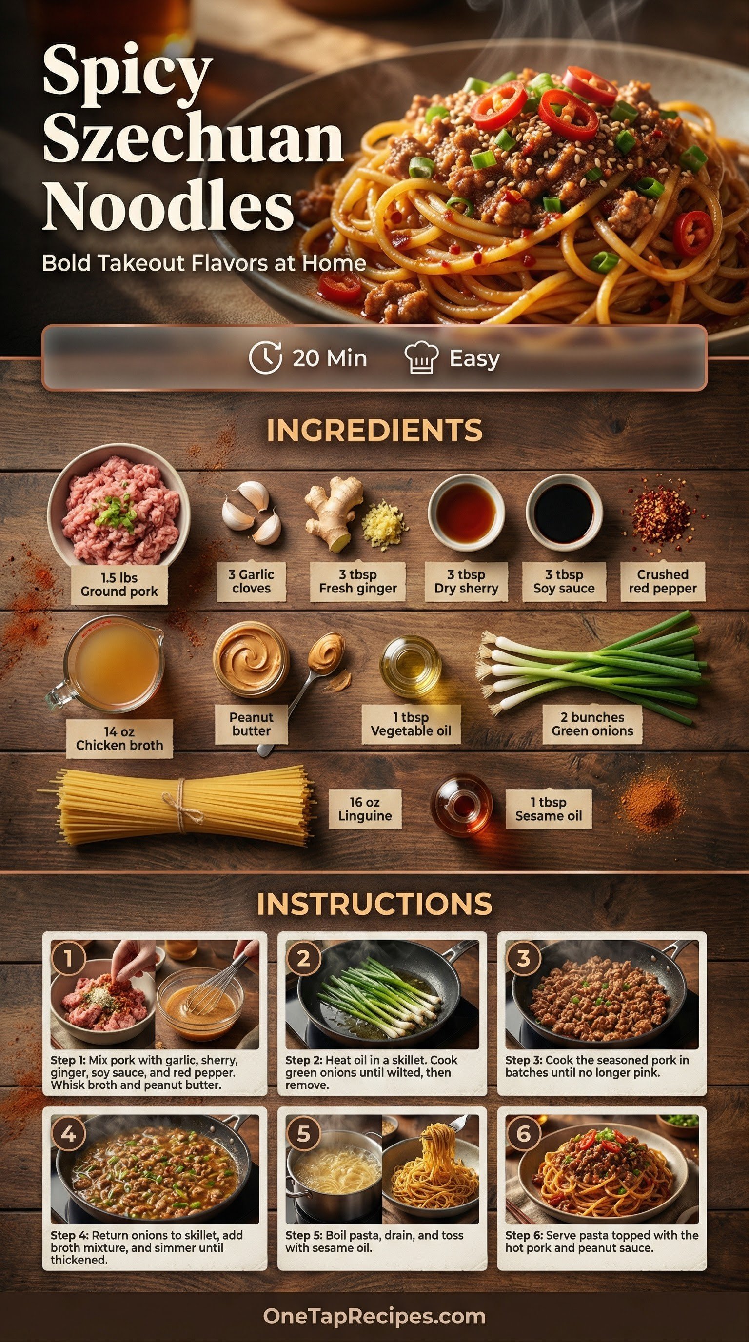 A steady, warming heat from crushed red pepper balances the rich peanut sauce in this comforting noodle bowl. Ground pork cooks down with fresh ginger, garlic, and soy sauce to build a deeply savory base. A quick blend of chicken broth and creamy peanut butter coats every strand of pasta. When you crave takeout but want something fresh from your own kitchen, this hits the spot. It's a deeply satisfying dish that brings massive flavor to the table.