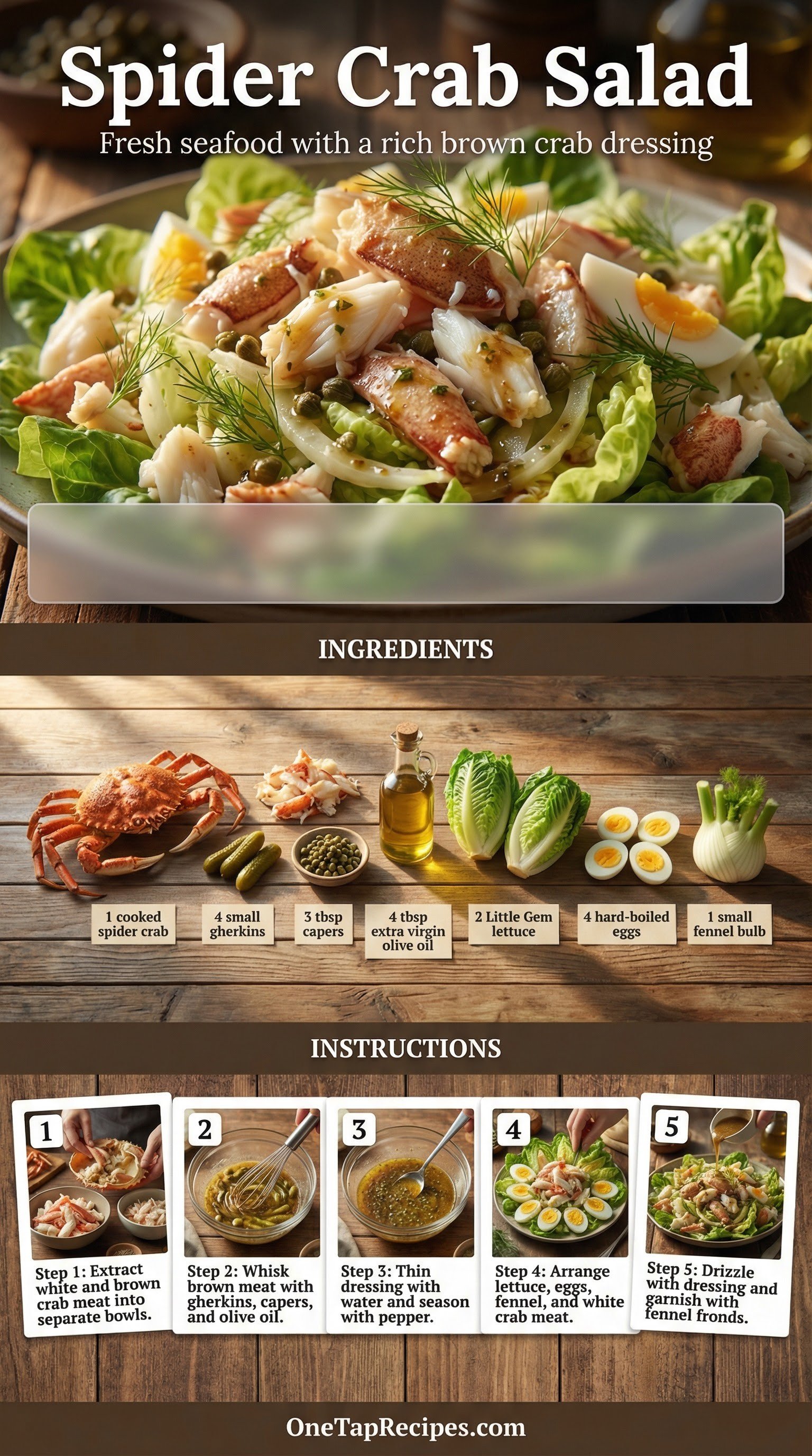 Fresh spider crab takes center stage in this crisp seafood salad. The dish makes smart use of the whole crab by turning the rich brown meat into a briny, savory dressing mixed with chopped capers and diced gherkins. Crisp Little Gem lettuce and thinly sliced fennel provide a crunchy base for the sweet white crab meat and quartered hard-boiled eggs. It makes an excellent light lunch or an elegant starter for a dinner party.