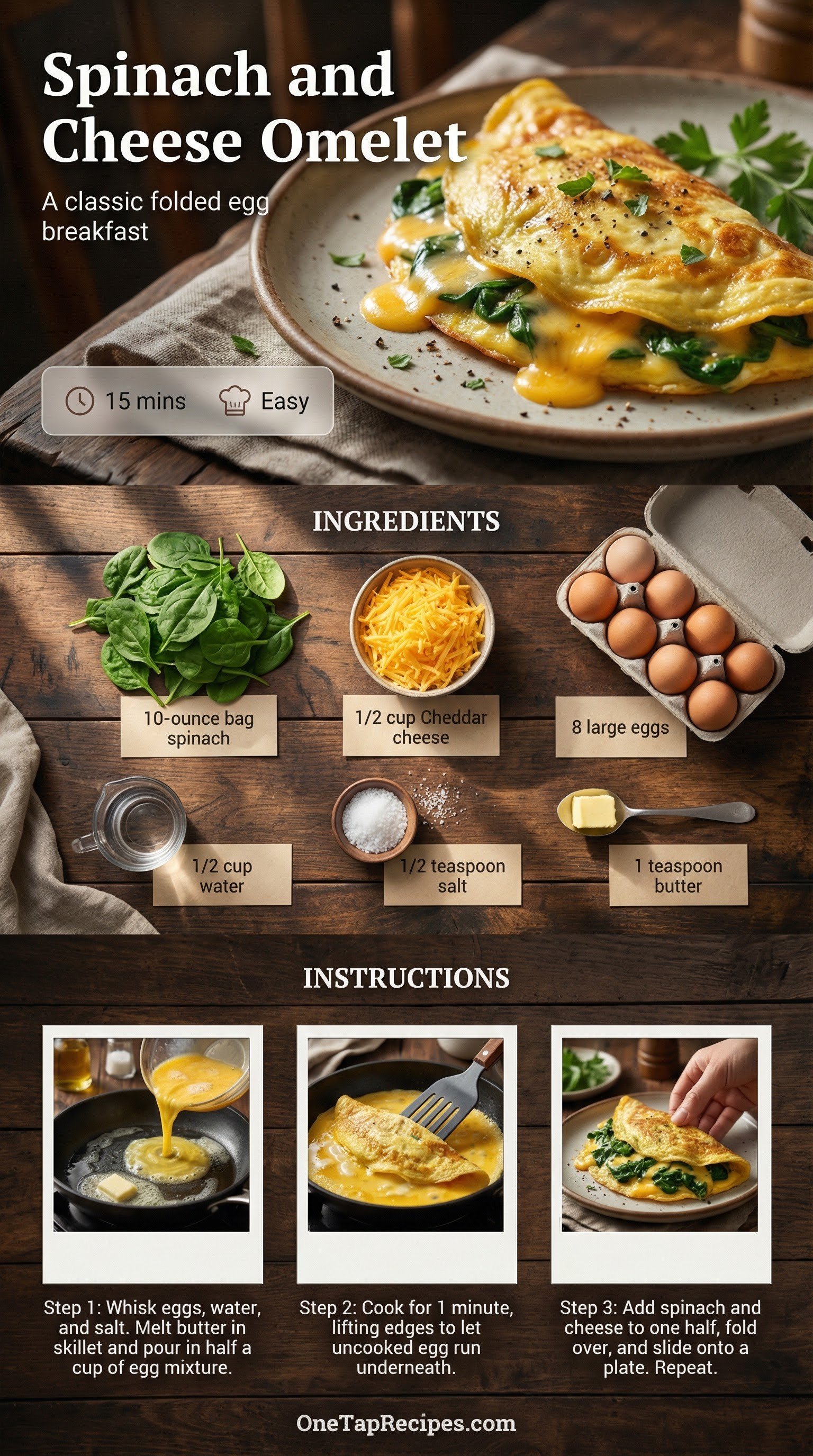 A classic folded egg breakfast filled with fresh greens and melted cheddar. The combination of tender spinach and sharp cheese creates a comforting morning meal that comes together quickly. Whisking a little water into the eggs keeps the texture light and fluffy as they cook in the hot skillet. Serve it hot alongside buttered toast or fresh fruit for a satisfying start to the day.